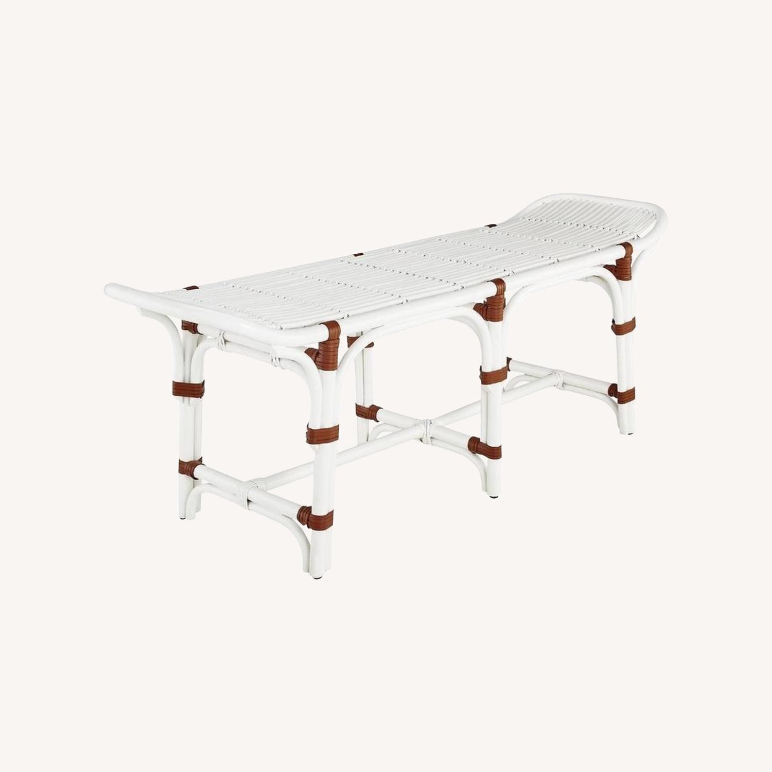 Seller's Notes:Stretch your seating options with a natural rattan bench painted sleek hi-gloss white. Rattan is steamed and bent to achieve such attractive curves, while handmade brown leather straps finish the look with finesse. Sloane White Rattan Bench is a CB2 exclusive. -Rattan with hi-gloss white finish -Brown leather accents. This piece has been so versatile for us - light and easy to maneuver while also being very durable - still looks perfect five years later.