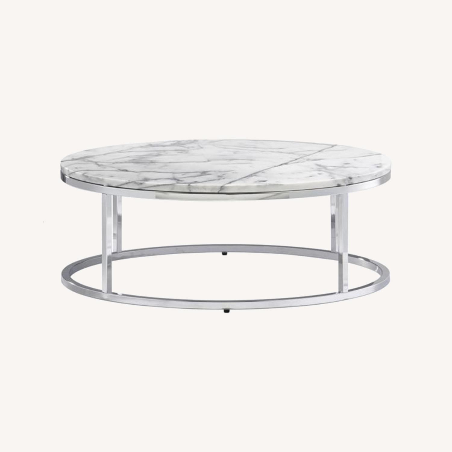 Seller's Notes:Purchased 5 years ago. In good condition, marble top has some water marks and a scratch on edge (1-2”) from moving. Small (less than 1/4”) divot on table. Shown in picture. Coffee table is smooth and cool with a subtle silvery glint of crystallization. Sports a low rise at just 12" off the floor. Smart Round Marble Top Coffee Table. 33" dia. x 12.25"H Carrara-style white marble top with grey veining Steel tube frame with a chrome-plated finish Clean with a soft cloth Protect marble from liquids; wipe up spills immediately Coasters recommended