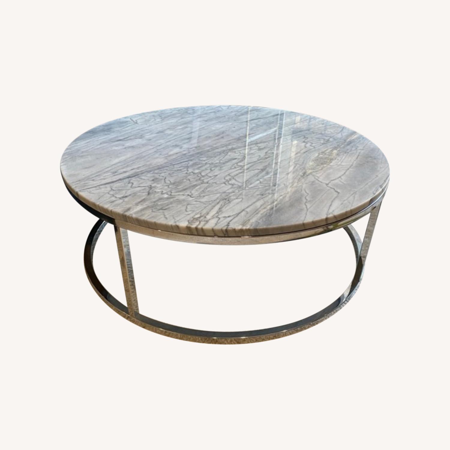 Seller's Notes:Authentic Carrara-style white marble top with grey veining Open cylinder construction of slick polished chrome topped with a Carrara-style white/grey slab. Coffee table is smooth and cool with a subtle silvery glint of crystallization. Sports a low rise at just 12" off the floor