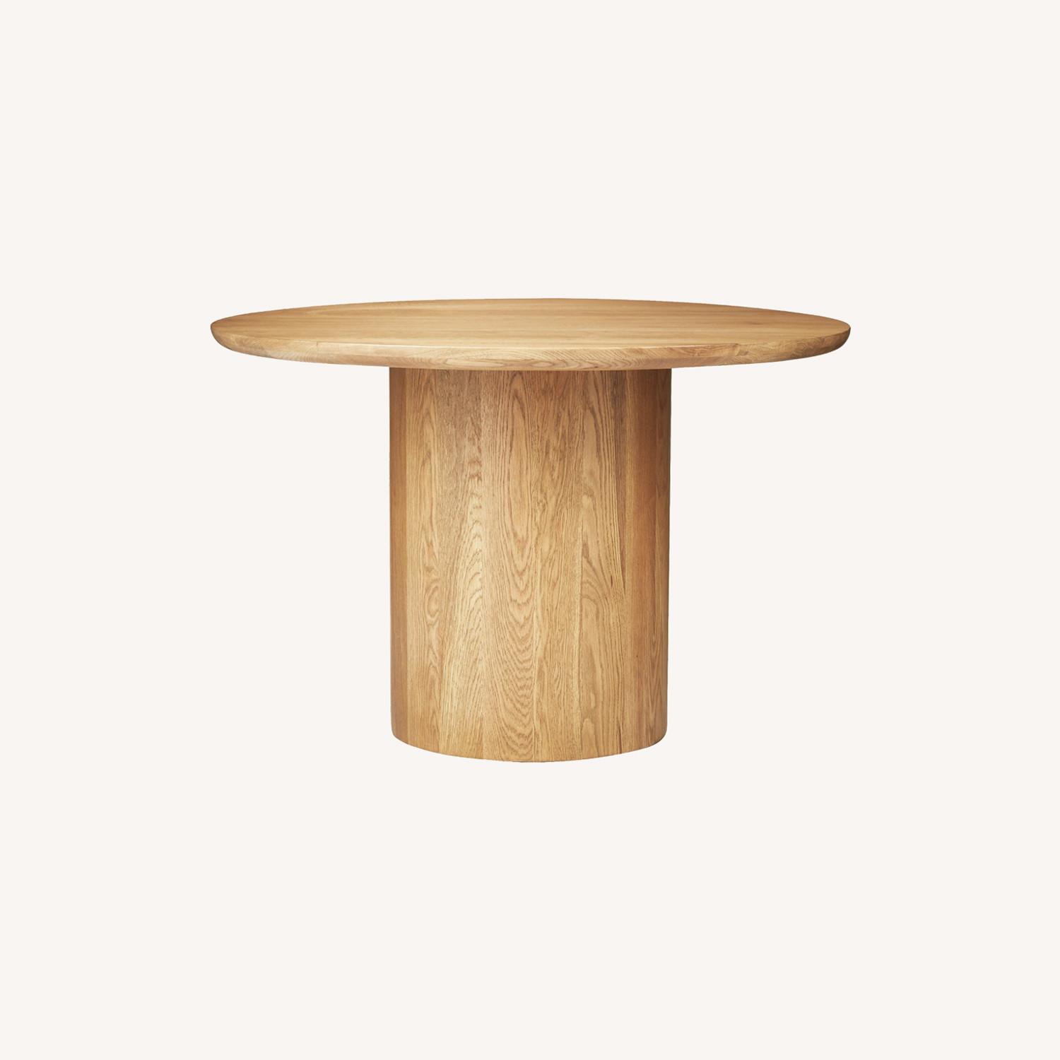 Seller's Notes:Thick, oak base and round shape of this GQ dining table invites durability and midcentury design into the home. Pull up leather/metal seating for an industrial edge or surround with all black to add contrast. Seats four comfortably. CB2 exclusive. Spindler Round Dining Table. 45" dia. x 29.5"H Designed by GQ Oak veneered base with solid oak top Seats up to four Clean with soft, dry cloth See photo to note the very light scratch.