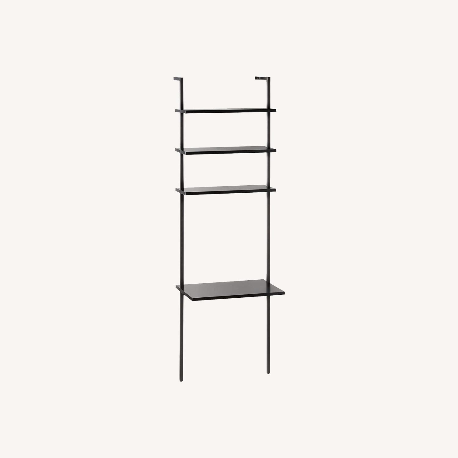 Seller's Notes:Beautiful, functional bookcase and desk all in one. Bought this a year ago specifically for this apartment but we are moving and this item is too tall for our new ceiling height. Minimalism scales for small spaces in rich black. A taller version of a CB2 favorite, sleek desktop surface and three shelves ladder up in engineered wood with dark lacquer. Powdercoated aluminum frame with hidden hardware accentuates spotless rise. Mounts sturdy to the wall. Create a vertical library with stairway Black Wall Mounted Bookcase. CB2 exclusive.