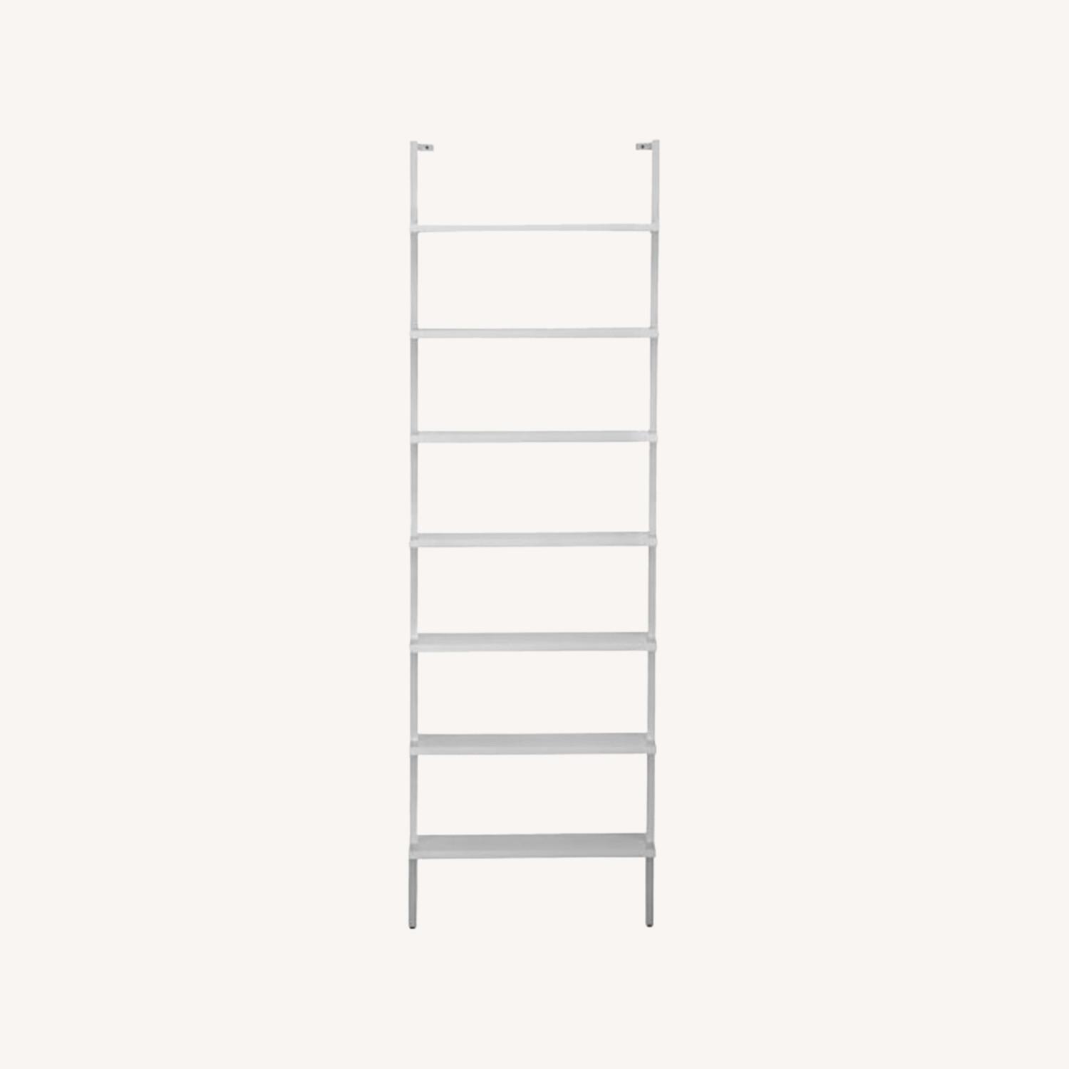 Seller's Notes:White powdercoated aluminum frame Seven engineered wood shelves with hi-gloss white lacquer Mount to wall Made in Vietnam Genuine CB2. Two stairway white ladder bookshelves. Sold separately. Some minor scratches and blemishes from use but many good years left. Moving and they don't fit in the new space.