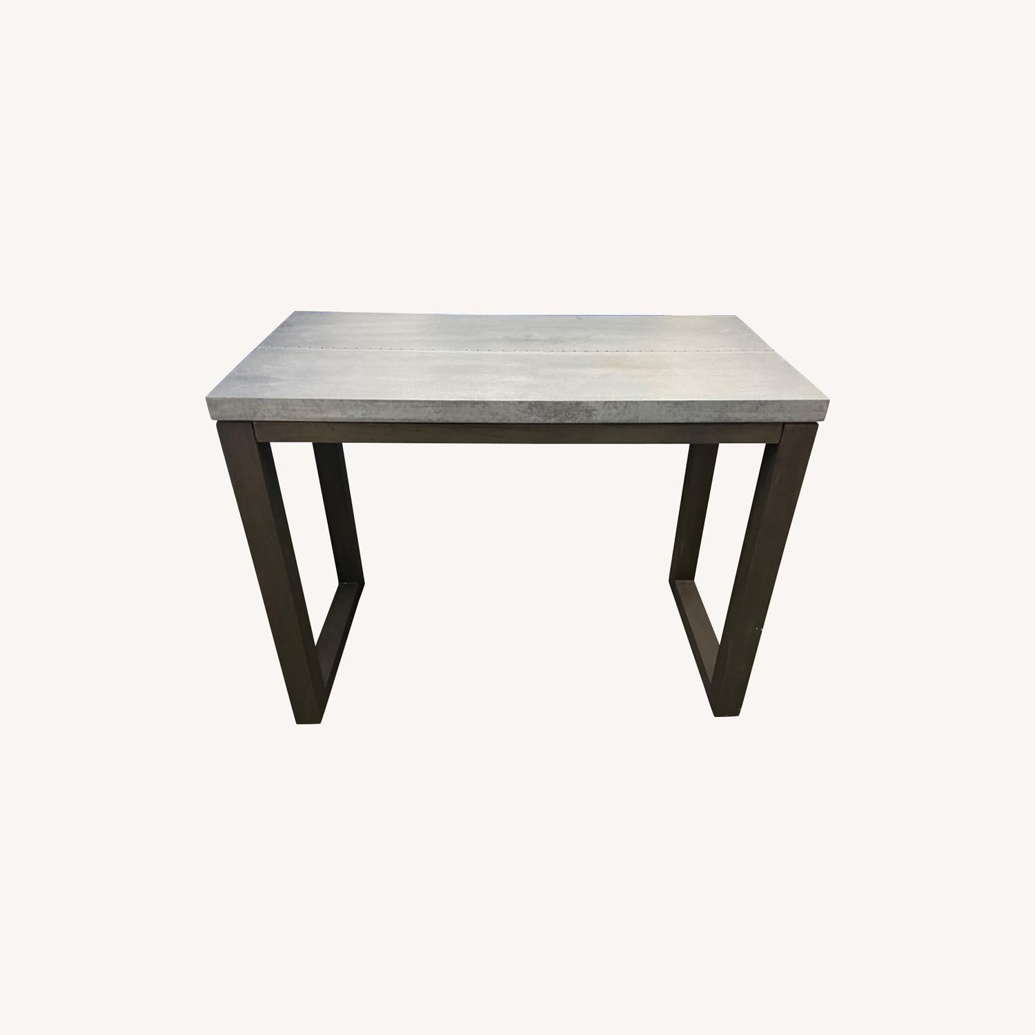 Seller's Notes:We nailed it. Our first counter height just right table tops out in galvanized antiqued metal sheet over engineered wood with exposed mini nails hand-hammered down the seam. Sustainable plantation grown solid mango wood frames open continuous to the floor in an antiqued grey. Kitchen and dining obviously, but think bar, console, drafting table. Stern 37 high counter table is a CB2 exclusive. -Low-emission engineered wood top wrapped in galvanized sheet metal -Sustainable solid mango wood base with an antiqued grey wash. -Wood characteristics: mineral deposits, grain, knots and seasonal splitting may occur with changes in humidity and are inherent in product -Accommodates barstools with 24H seats -To protect temperature-, moisture-sensitive artisanal surface, use coasters and placemats -Made in India *** Still in great condition. Perfect for dining and working from home (with stools), food prep (while standing). I’d love to keep it, but we’re moving and it doesn’t work in our new space.