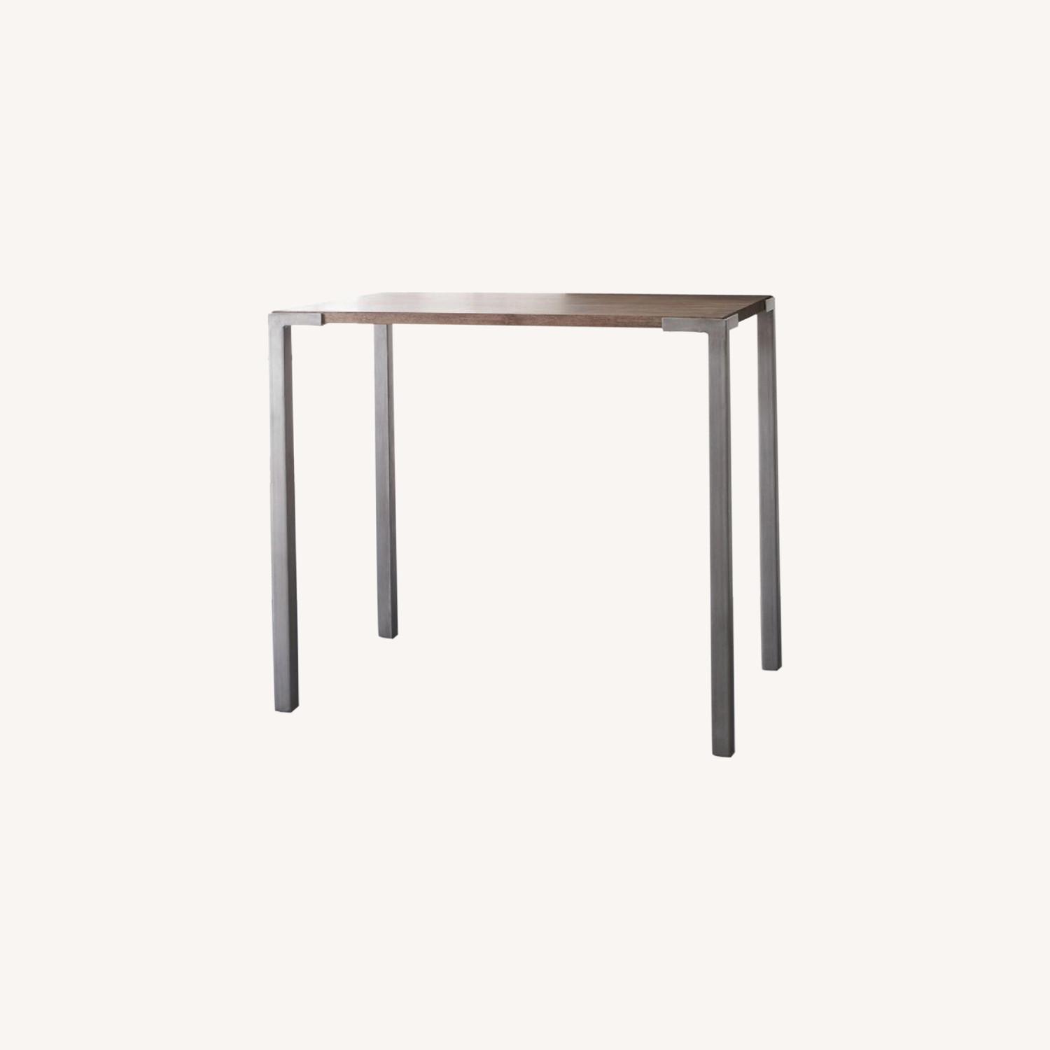 Seller's Notes:Sustainable, plantation-grown solid mango wood protected with eco water-based finish niches on high into an industrial iron frame with an antiqued zinc finish. The top is honed super smooth to the touch, stained a mid-tone brown that reveals sweeping wood grain. Excellent condition. Sturdy and stylish.