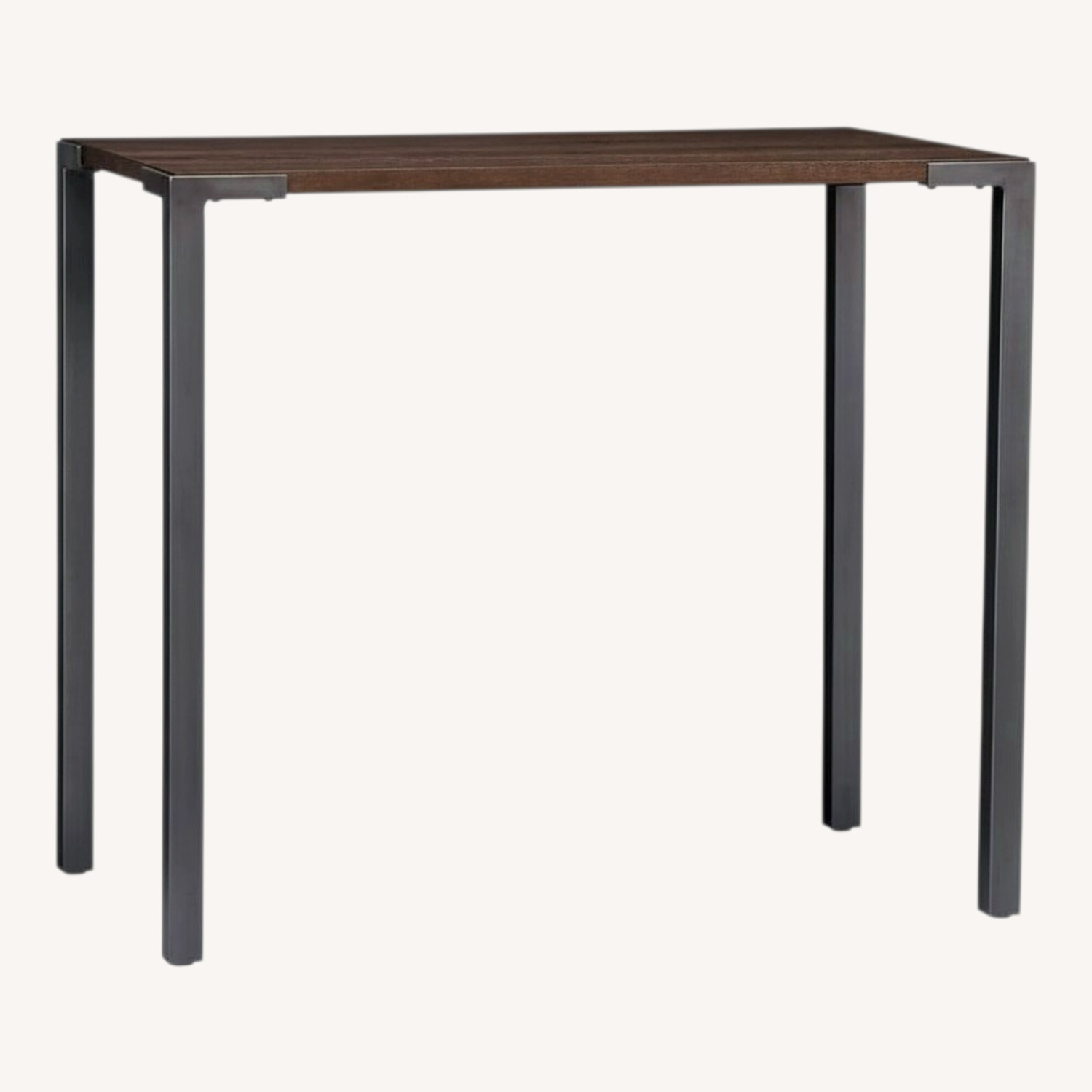 high on eco. Sustainable, plantation-grown solid mango wood protected with eco water-based finish niches on high into industrial iron frame with antiqued zinc finish. Top is honed super smooth to the touch, stained a midtone brown that reveals sweeping wood grain. Hi-dines four, tends bar, takes meetings.