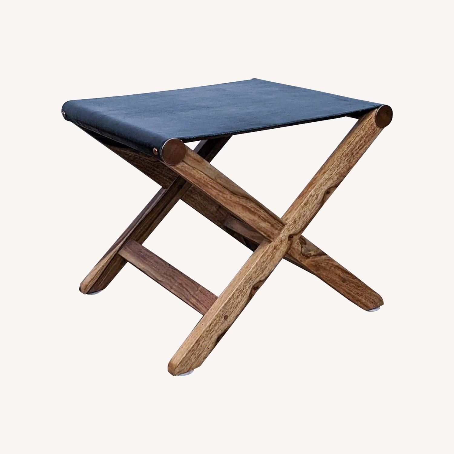 Seller's Notes:Description: Modern Black Leather Seat Ottoman On Solid Wood Frame With Metal Accents . Brand: CB2. Material: wood,leather. Seat heigt: 0. Gently used - any blemishes or damage will be included in the photos. #SKU: 1060726. Tags: wood,modern,metal,leather