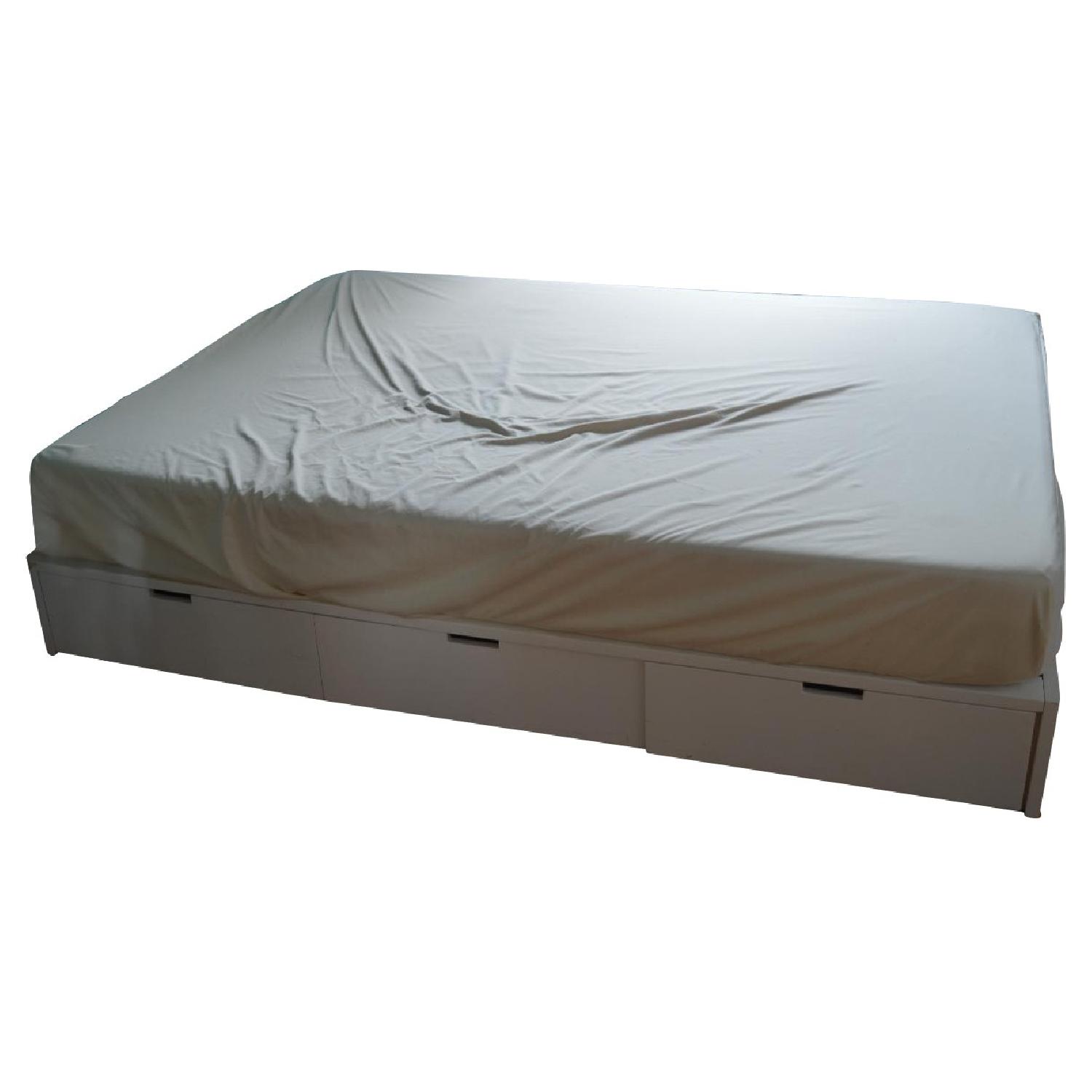 Seller's Notes:I purchased this bed about 2 years ago and am currently moving out of my apartment. It is simple, offers ample storage and is great. 6 Large drawers pull out from under the bed and wooden slats to support sleeping surface. A few of the drawer fronts came off in the past and were repaired. They work now. Please see close-up photos for more info. Website Description white space. Clean white drawers hide storage down under in clever sleep space by Diana Lu of Slate Design. White oak and plywood frame bunks three built-in drawers per side to stow books, linens, tees. A smart option for small space lodgings, drawers close flush to frame, pull out smooth on casters via integrated handles. Neat platform sleeps sans headboard to float in room. Designed by Diana Lu of Slate Design White oak and plywood with hi-gloss white lacquer finish Three drawers on each side