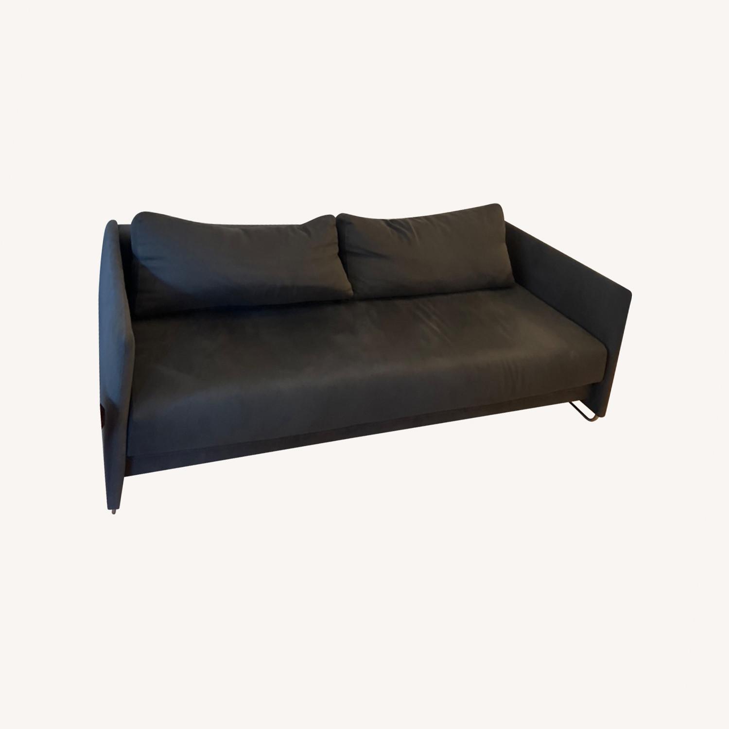 Seller's Notes:Modern tandom sleeper sofa dark grey ii. Modern design sits deep with oversized back cushions on polished metal tube frame. Goes from upright to lights out via easy one-person operation: off with the back cushions, pull up seat and extend front legs from hidden zipper pockets beneath. Slide seat forward and fold down back. ~RL