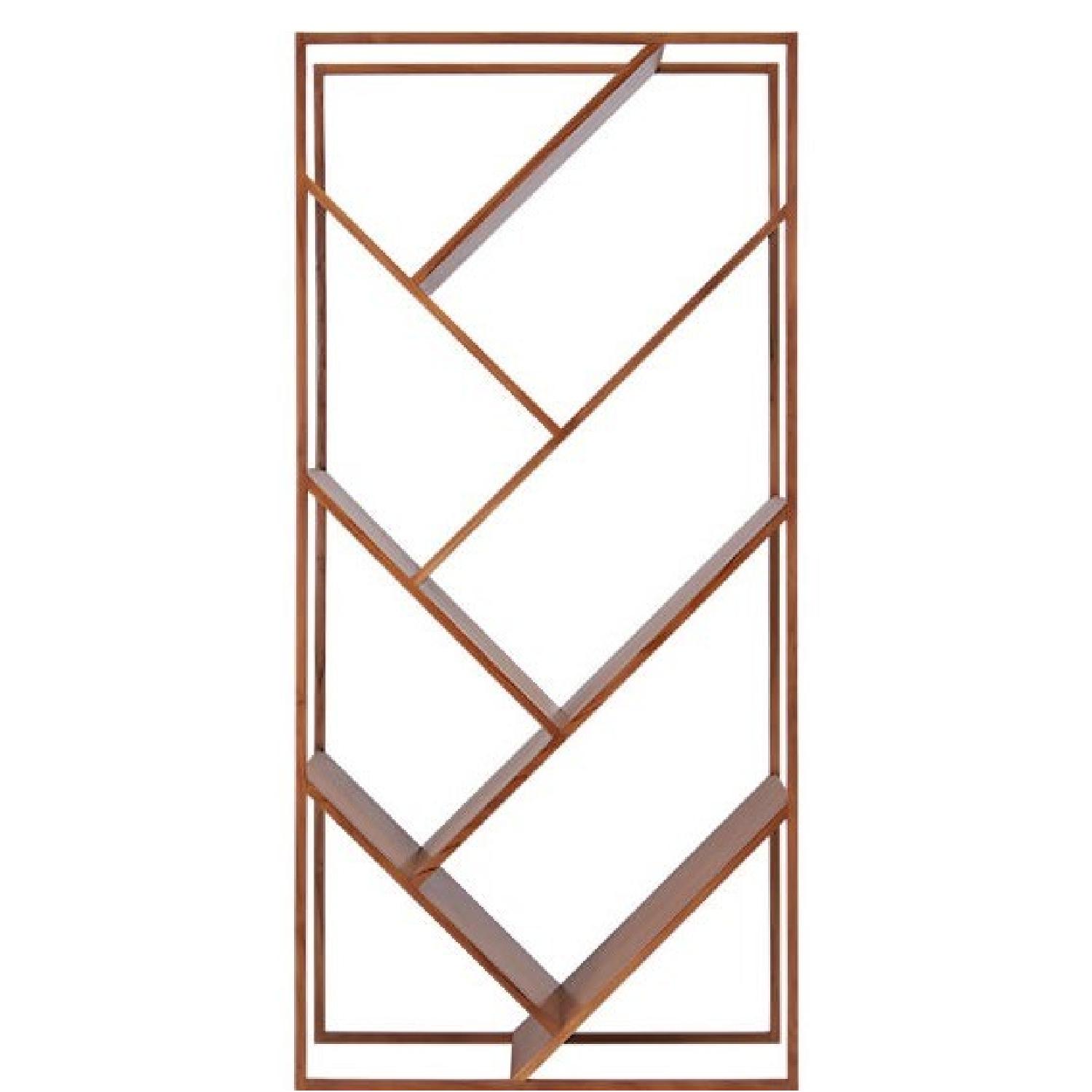 Seller's Notes:Minimalist Slant. Miron Lior's inventive design angles to add interest to any size space. Open solid-teak frame braces seven slanted shelves in rich wood tones and active grain. Alternating angles create an airy, uncluttered silhouette to beautifully break up a large room or divide a small studio. Displays books and disguises clutter. Double them up for added drama. v bookcase-room divider is a CB2 exclusive. Details - Designed by Miron Lior - Teak wood - Mid-tone stain - Wipe with soft dry cloth - Made in China