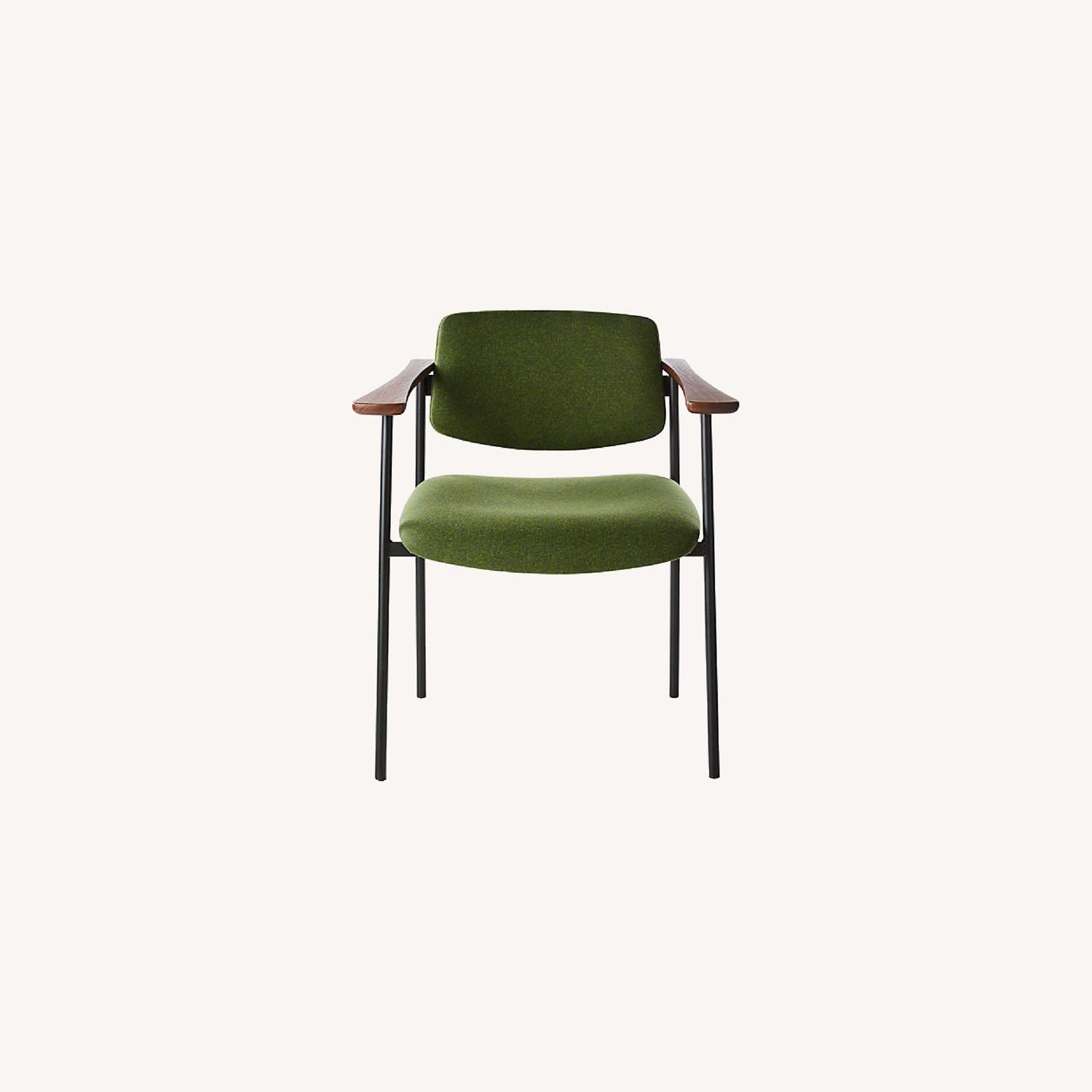 Seller's Notes:Versatile piece works in the office, at the dining table or in any living space. Italian-made of matte black steel and ash wood, chair layers a sophisticated pop of color in green wool fabric. Designed by Omar De Biaggio 100% wool fabric, green Steel frame with matte black finish Ash wood arm rests Genuine CB2.