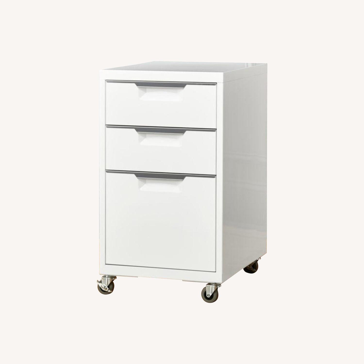Seller's Notes:Two drawers top a letter/legal file. Stainless steel drawer grips; four casters (front two lock). * Perfect condition, hardly used * Durable steel sheet construction with stainless steel handles * White powdercoat finish * Fits legal/letter files * Four 2" casters; brakes on two front casters ~RL