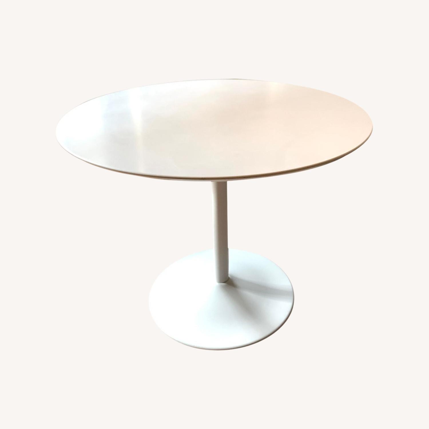 Seller's Notes:A high styling, hardworking table for all your spaces: dining, kitchen, living, office! White lacquered wood composite disc beveled at the edge floats on a white powdercoat metal pedestal that seems to emerge from the floor. No signs of wear White Dining Table 39.25" dia. x 30.25"H Top: wood composite with smooth white lacquer finish Base: 23.5" dia. metal with white powdercoat finish Beveled rim