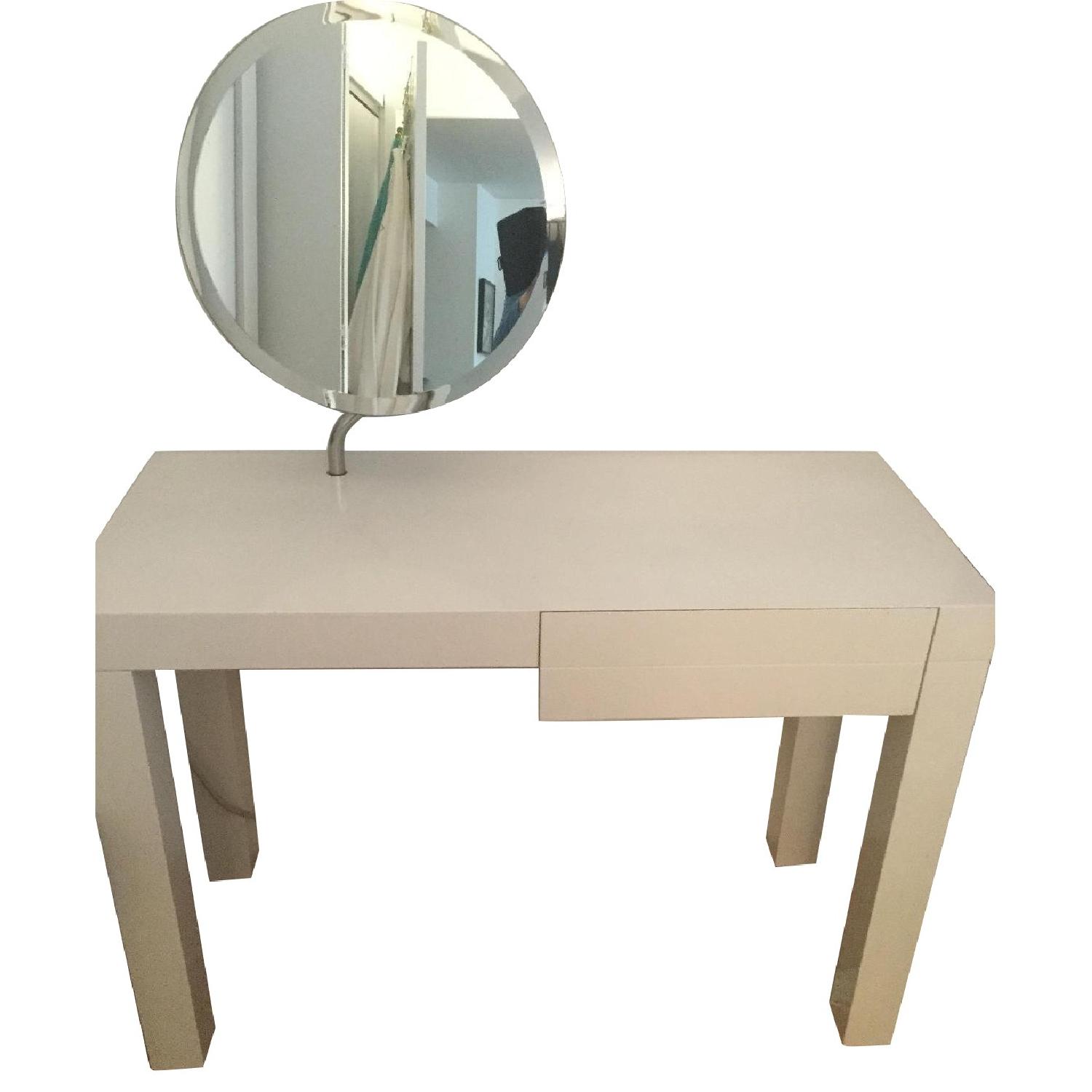 Seller's Notes:CB2 white lacquer desk with draw and a vanity- an attached circular mirror.