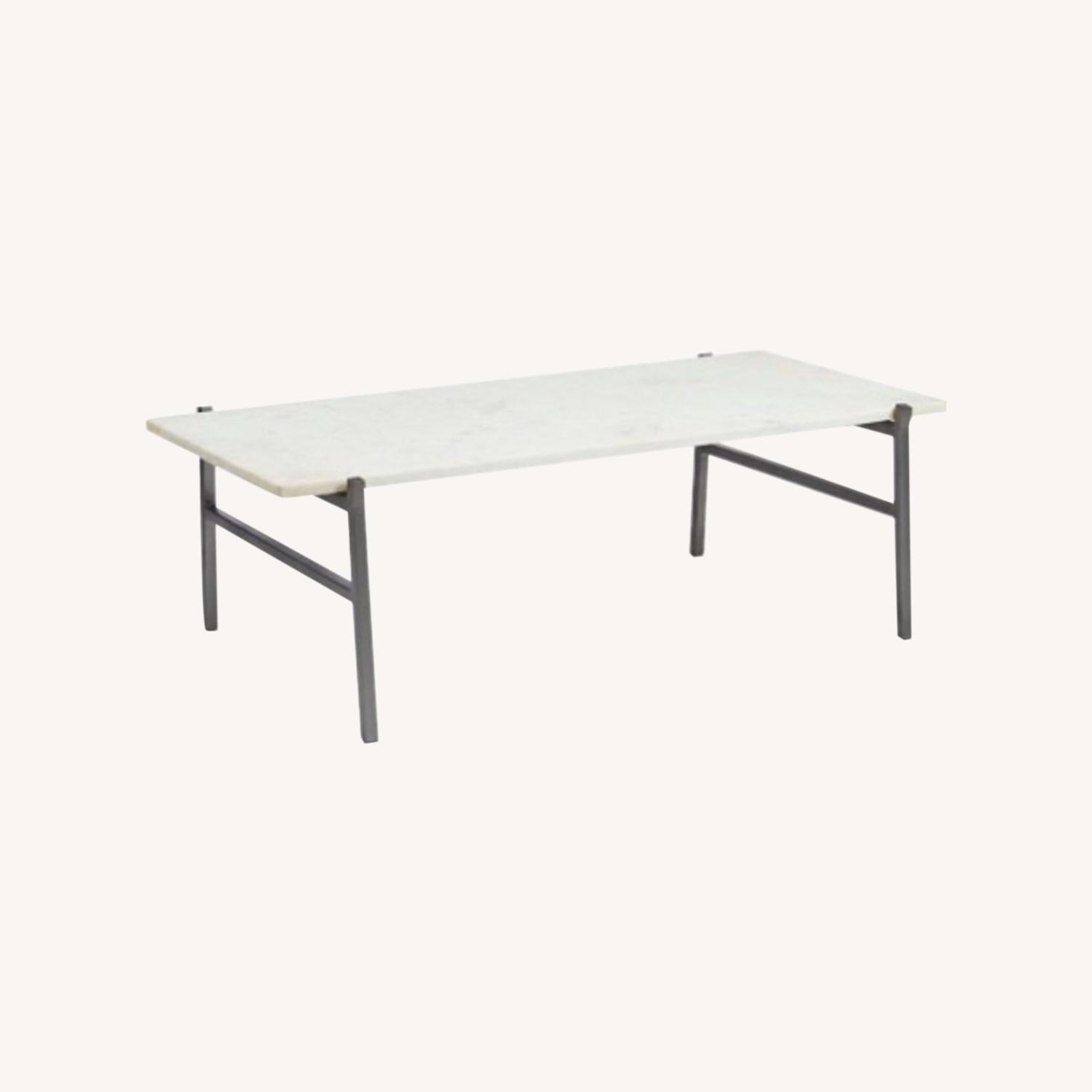 Seller's Notes:Beautiful modern coffee table cut from white marble ribboned with a gray vein and finished with a dark pewter frame and leg. This coffee table has been the star centerpiece of the living room and will easily fit into any modern decor scheme. Very minor chips in one corner (see photo). Otherwise in great condition.