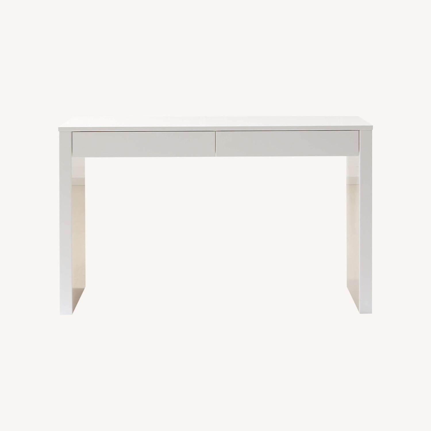 Hi-gloss white lacquer desk downsizes for space but ups the style quotient for office, entryway or bedroom. Discreet sleek dual drawers organize desk supplies and papers, keys and mail (perfect entry console), even cosmetics (makes a great vanity, too). Pair with a modern office chair for a chic and functional space.
