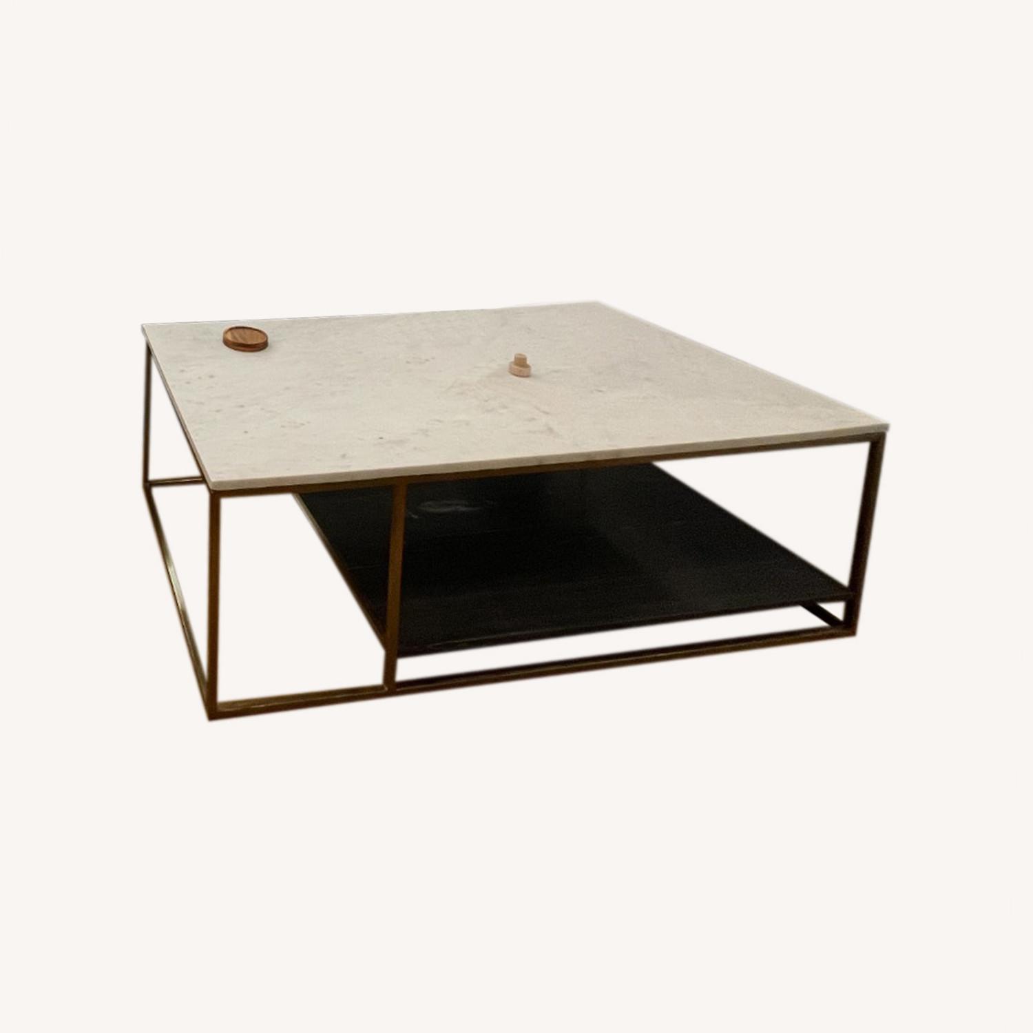 Seller's Notes:The coffee table is in excellent condition despite its minor scratches and its very light coffee stains that are hardly noticeable. For 1 of the 4 years of its life, the table was in storage. When the table was removed from storage, the movers accidentally scratched the metallic part of the table (viewable in the photos). Overall, the table is a beautiful piece of furniture that is versatile for most living room spaces. I am really happy for whoever will own this stunning coffee table next! Thank you.