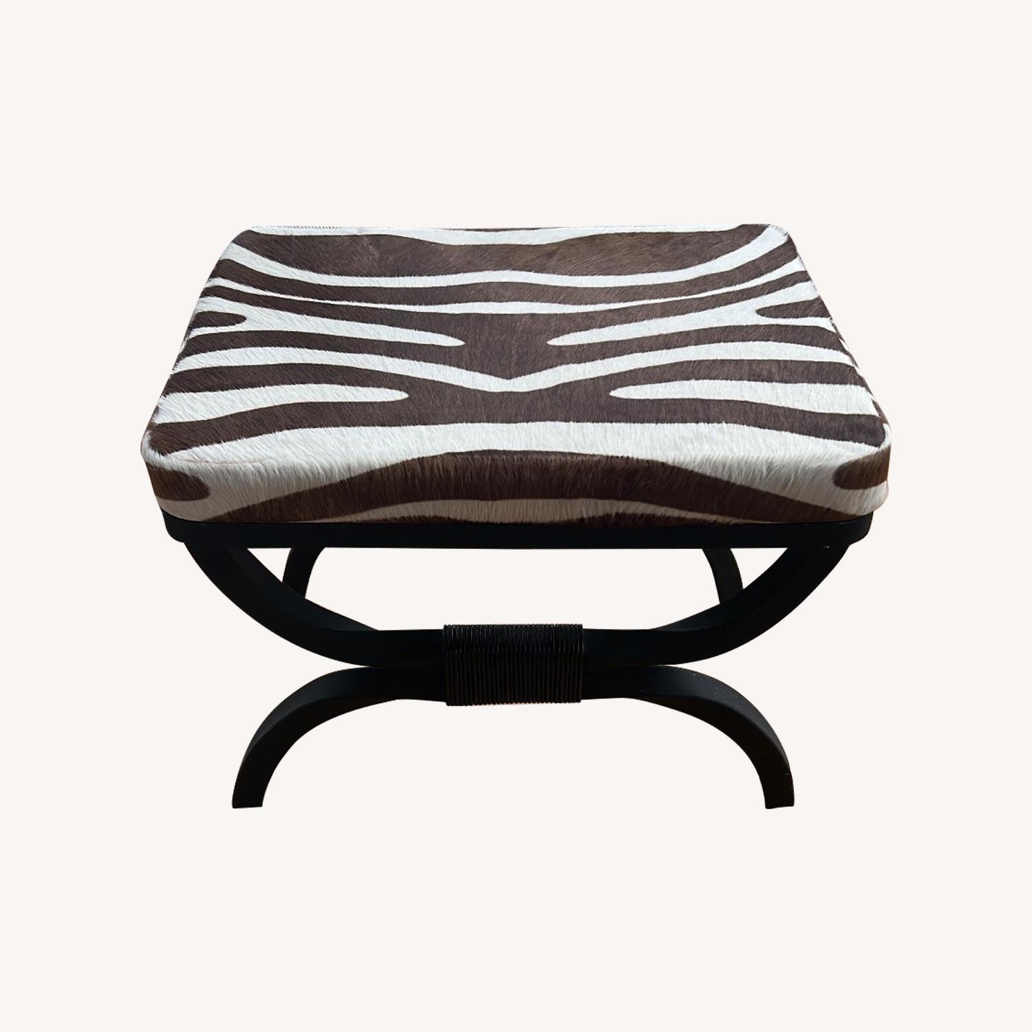 Seller's Notes:Cloaked in chic zebra pattern, modern cowhide stool reigns with traditional Louis XVI style. Elegant mild steel legs curve in matte black, slightly wider than their predecessors. Genuine cowhide-covered seat offers a solo spot in the entry or living room, or pair two together in front of a fireplace or at the end of the bed for a grander statement.