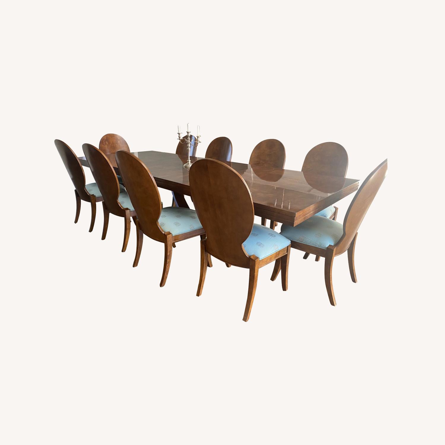 Seller's Notes:Gracious expandable wood “Omni” dining set from Century Furniture, seats 10 comfortably (extends to 122"!). Beautiful wood construction throughout and art deco influence. Great condition with only a few small imperfections (pictured). The set comes complete with: - 12 "Omni" chairs (10 side chairs and 2 armchairs). Material: European Beech solids/Cluster Maple veneer w/plywood upholstered in a silk-like polyester. - 1 "Omni" pedestal dining table in maple solids & maple veneers that create a beautiful checker pattern. Classic contemporary/art deco style. 78"-122" maximum extension. Custom table pads included. Excellent condition. One small knick at the table's edge (see picture) / Some small scratches on one chair airm (see picture), and one small mark on one upholstered chair which can likely be cleaned There is also a matching “Omni" sideboard credenza (sold separately! Check out my other listing). Current retail price at retail: Table ($10,950) / Chairs (~$800ea)