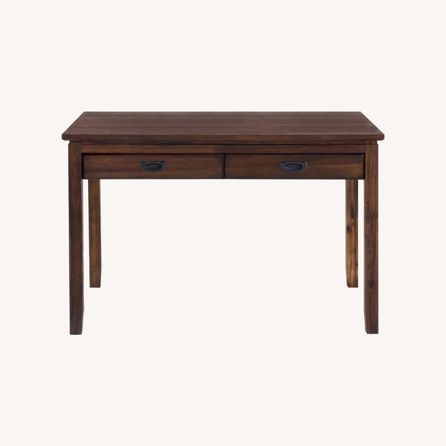 Seller's Notes:DARK BROWN DESK (close to Mahogany), BEAUTIFUL WOOD FINISH THROUGHOUT. EXCELLENT CONDITION (STURDY. NO WOBBLES, STAINS or DISCOLORATION ). Great for a school-aged kid. The desk has a few scratches on the top, but the surface is very smooth and great to write papers on with a pen. The desk comes with TWO DRAWERS. The CHAIR is very sturdy, with no wobbles. A minor "natural" scratch on the back.