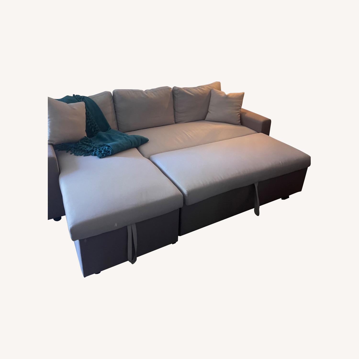 Seller's Notes:I became the primary caregiver to my late mother. Chaise couch was used so that I could sleep next to her on her hospital bed w/in our home providing care for her as needed. The Chaise Couch is a modern reversible sleeper sofa and chaise with ottoman. Converts to a sleep space with ease for overnight guests. One of the sofas arms features two side-out stools offering additional seating. The seat cushions are removable for easy cleaning. 2 matching square toss pillows. Storage under the chaise. Two couches available - one in two toned light/dark grey and the other in two toned light/ dark green.