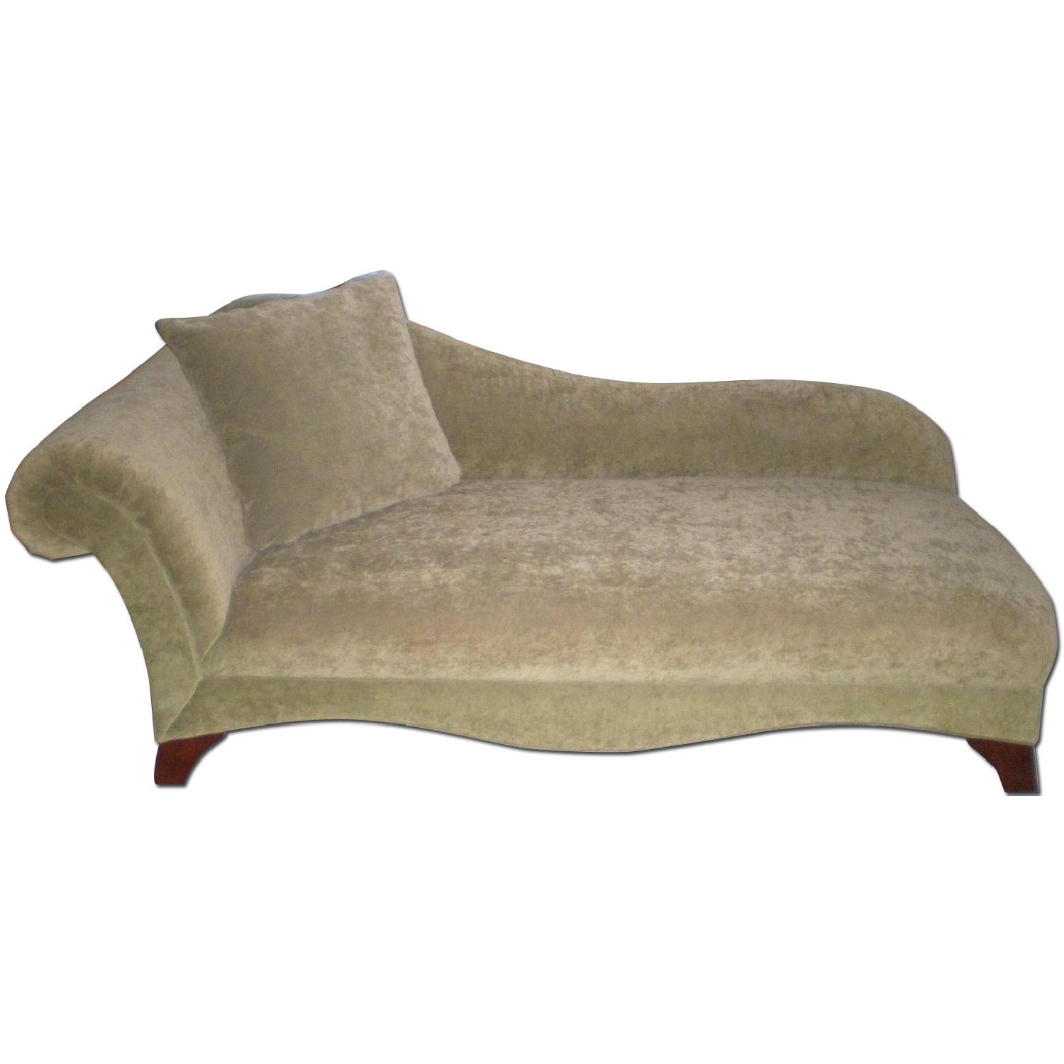 Seller's Notes:Beautiful and comfortable left-arm chaise lounge is from a smoke-free and pet-free home. Seating cushion is plump yet firm. Matching oversized pillow adds style and comfort. Rarely used, it’s just like new! Stretch out and watch T.V. or take a nap. This roomy chaise also doubles as a couch with ample room to seat three adults. Gracefully curved arm and sloped back are matched with the same beautiful curving detail below, as seen with the integrated skirt, in both the front and back of this extremely comfortable chaise. The integrated legs extend the smooth lines of this stylish detail. Olive green, stain resistant, microfiber fabric is complimented by dark brown, elegantly shaped, built-in, solid oak, legs, which continue the sweeping curves from end to end. Fully finished back allows this seating to be placed anywhere in a room showing off the details and smooth lines of all 4 sides. Ideal seating, set back from a wall or window.