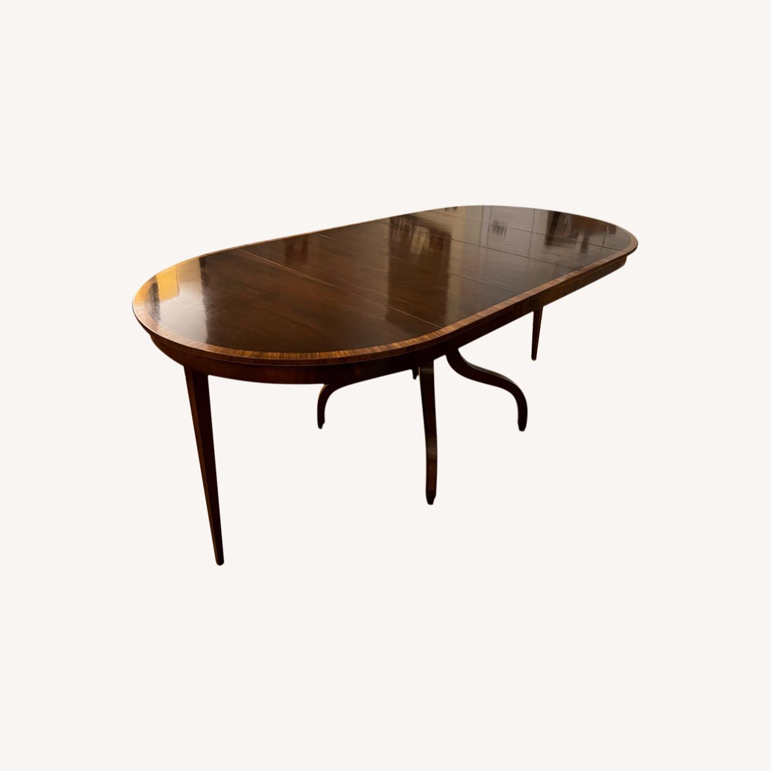 Seller's Notes:Charak Furnture Co. Dining room table is a family heirloom originally purchased back in 1952. This handmade vintage table made by the company nearly 60 years ago features a made in the USA mahogany wood table with 3 additional leaves to allow you to adjust the table to sit 2 or sit 12 even featuring a secret compartment where additional support legs come out (as featured in the photo). The smallest configuration is a 39" oval table with brass footed legs and each leaf is 13" across. Hand inland wood design stretches across the outside of the oval table and accents what is a dark rich brown finish. After many years of love and use the sides of the legs show signs of chips (in photos), the surface of the table has some blemishes and one of the leaves does have some white visible scratches but otherwise as can be seen from the photos it s in good condition. Happy to also sent videos and answer any inquiries to avoid any confusion.