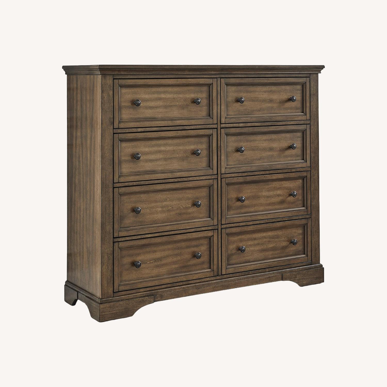 Seller's Notes:The Universal Broadmoore Charleigh 8-Drawer Chest is a classic bedroom storage piece featuring a rich, warm brown wood finish. Constructed from rubberwood solids and birch veneers with a blonde chocolate finish, this chest offers ample storage space with eight smooth-gliding drawers. The dresser measures 55.9 inches in length, 44.7 inches in height, and 17.9 inches in depth, making it a substantial addition to any bedroom.