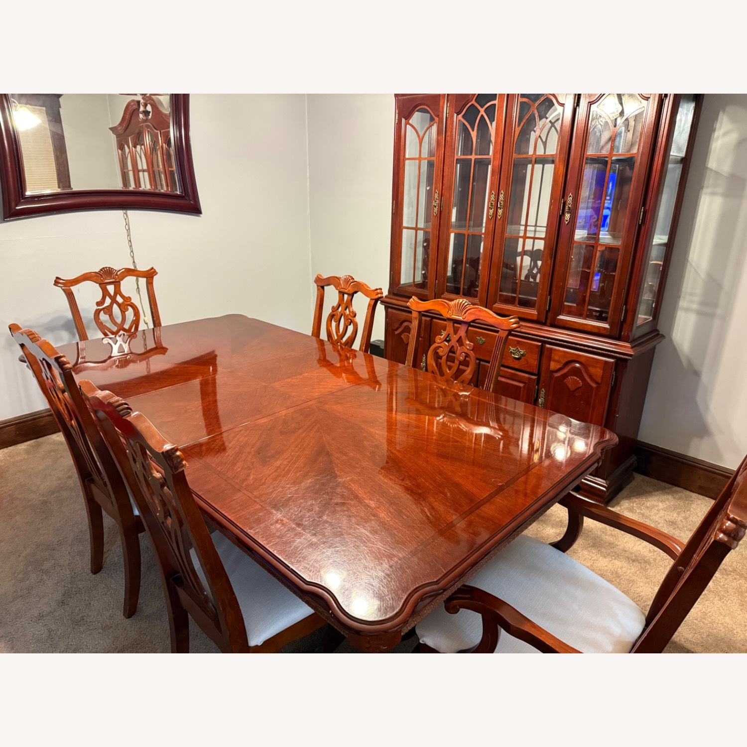Seller's Notes:Elegant Cherry Wood Dining Room Set – Complete with Table, Chairs, Pads & China Beautiful cherry wood finish dining room set in excellent condition. This timeless and elegant ensemble includes: Dining Table with rich cherry wood finish Matching Chairs 6 chairs – 2 armchairs, 4 side chairs. All chairs have new fabric seats. Custom Table Pads to protect the surface The table has a leaf and is adjustable. The table with the leaf is 86”. The leaf is 18”. If you take the leaf out, it will be 18 inches shorter. Perfect for family gatherings or entertaining guests. The craftsmanship and classic design make this set a standout addition to any home. Gently used and well-cared-for in a smoke-free home. There is a matching China cabinet in a listing. Check that out also so you can have the full set.