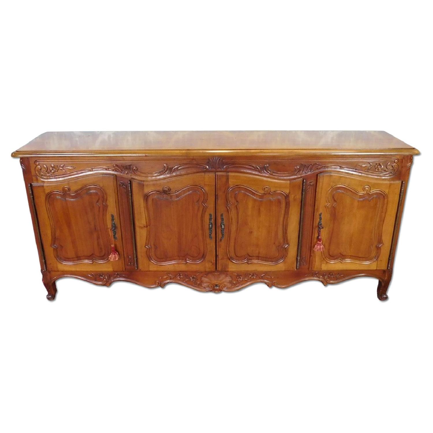 Seller's Notes:Description: This is a fantastic quality solid cherry French Provincial dining room buffet, French import, mid to late 20th Century. Extremely high quality. Large beveled top edge over a carved upper frieze over 4 carved paneled doors with large brass hinges. Right and left side cabinet doors opening to interior shelves with middle 2 doors opening to a single shelf with decorative veneered edging over a single palisander wood drawer. Case stands on small carved cabriole style legs. Sides of cabinets having a single upper drawer over a paneled side. No manufacturer mark found. Measurements: 22 inches deep X 41 1/2 inches high X 95 inches wide.