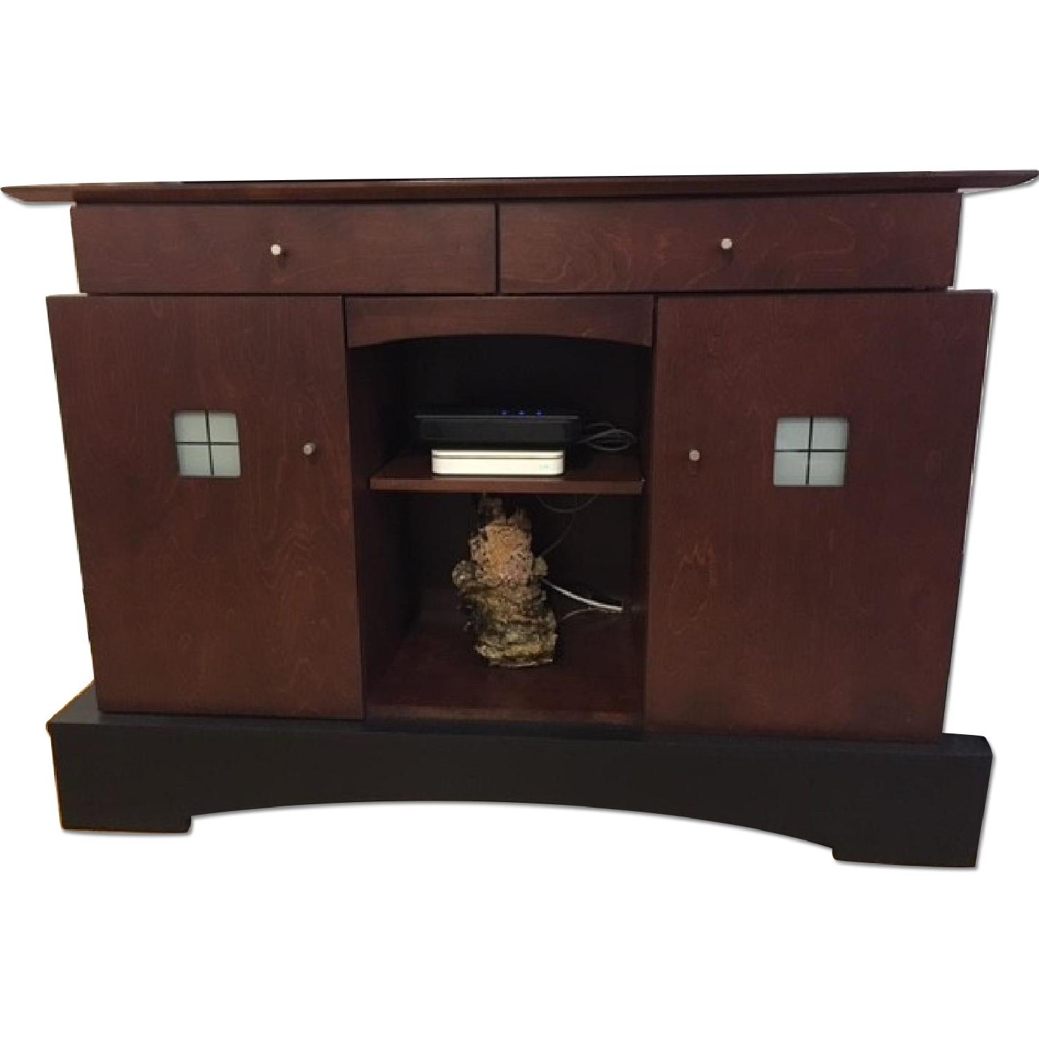 Seller's Notes:Beautiful American made Cherry Wood Credenza, which can be used as TV stand, buffet or bar. Lots of storage with two drawers and two cabinets. Measure 50" Wide X 18" Deep X 36" Tall. Sturdy construction. Wood finished with anti-stain coding, so that it doesn't get ruined by water. Originally cost $800 new.