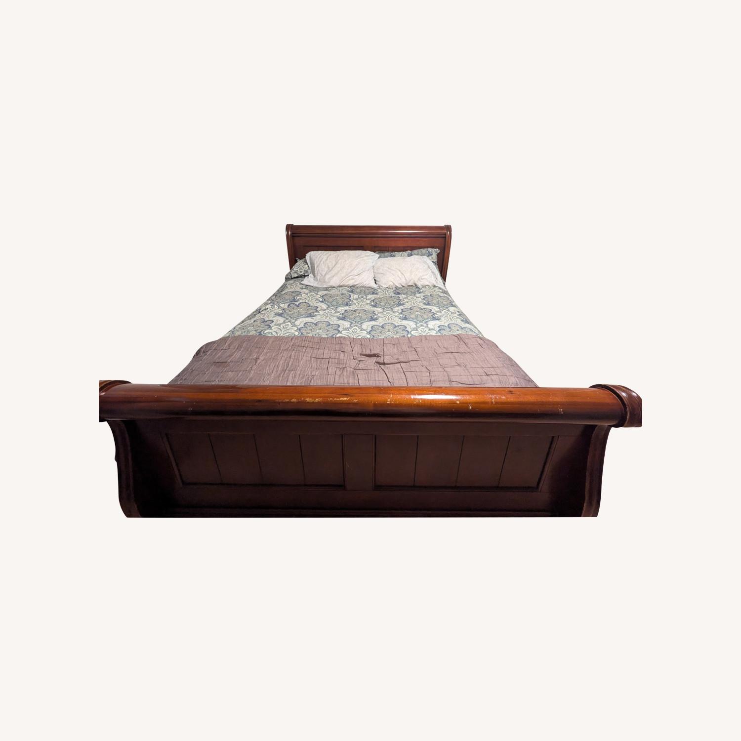 Seller's Notes:A queen-sized Cherry Wood Sleigh Bed . Very comfortable - has many years left. There are a few scratches, mostly toward the bottom of the frame - I've posted the worst damage in the pictures.