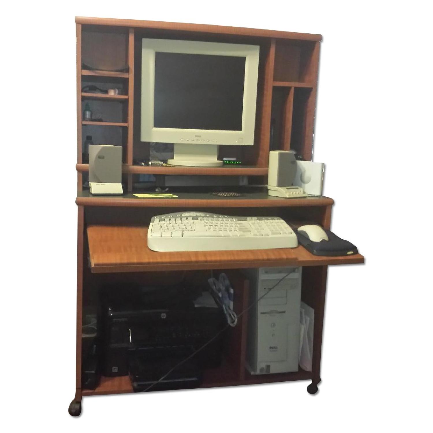 Seller's Notes:computer stand in fair condition can also sit flat screen 10 inch 2 15 inch screen also holes printer and tower at the bottom equipped with slide to hold keyboard.items in picture are not for sale