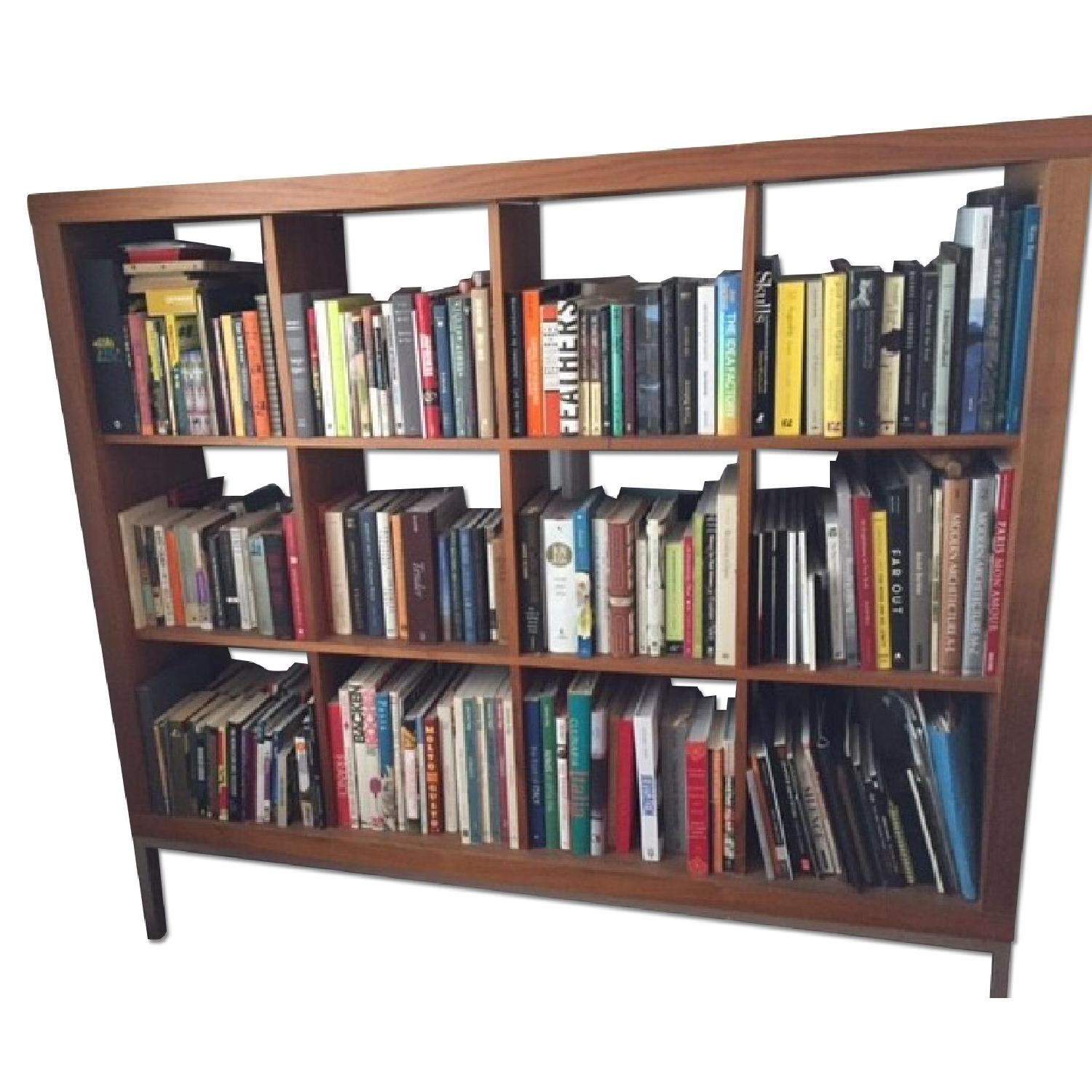 Seller's Notes:I purchased this bookshelf from an opera singer near Columbus Circle. They were moving. It was in a very pristine environment. The Veneer color looks like cherry wood and the bottom part is metal feet which are elevated about 9" from the ground.