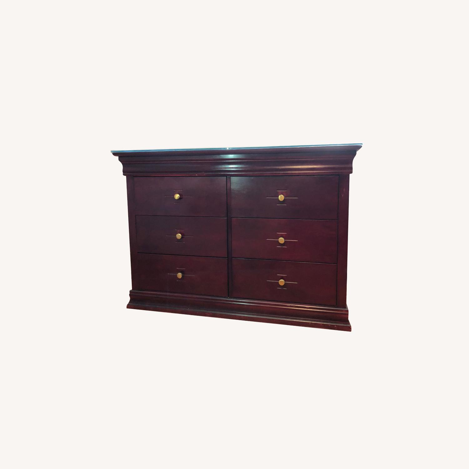 Seller's Notes:This is a well maintained dresser. It has 6 Drawers with interior drawer space measuring 5.75" high x 18"wide x 15.25" deep Drawers open on metal glides Currently there is a custom piece of glass covering the top of the dresser that I have been using to protect the top from scratches and such. 6 metal knobs that have a beautiful brushed brass finish. I am not sure if the knobs are brass but they definitely are brass color. I am eager to sell because we just moved and we are remodeling *Please note that I am also selling a matching Armoire.