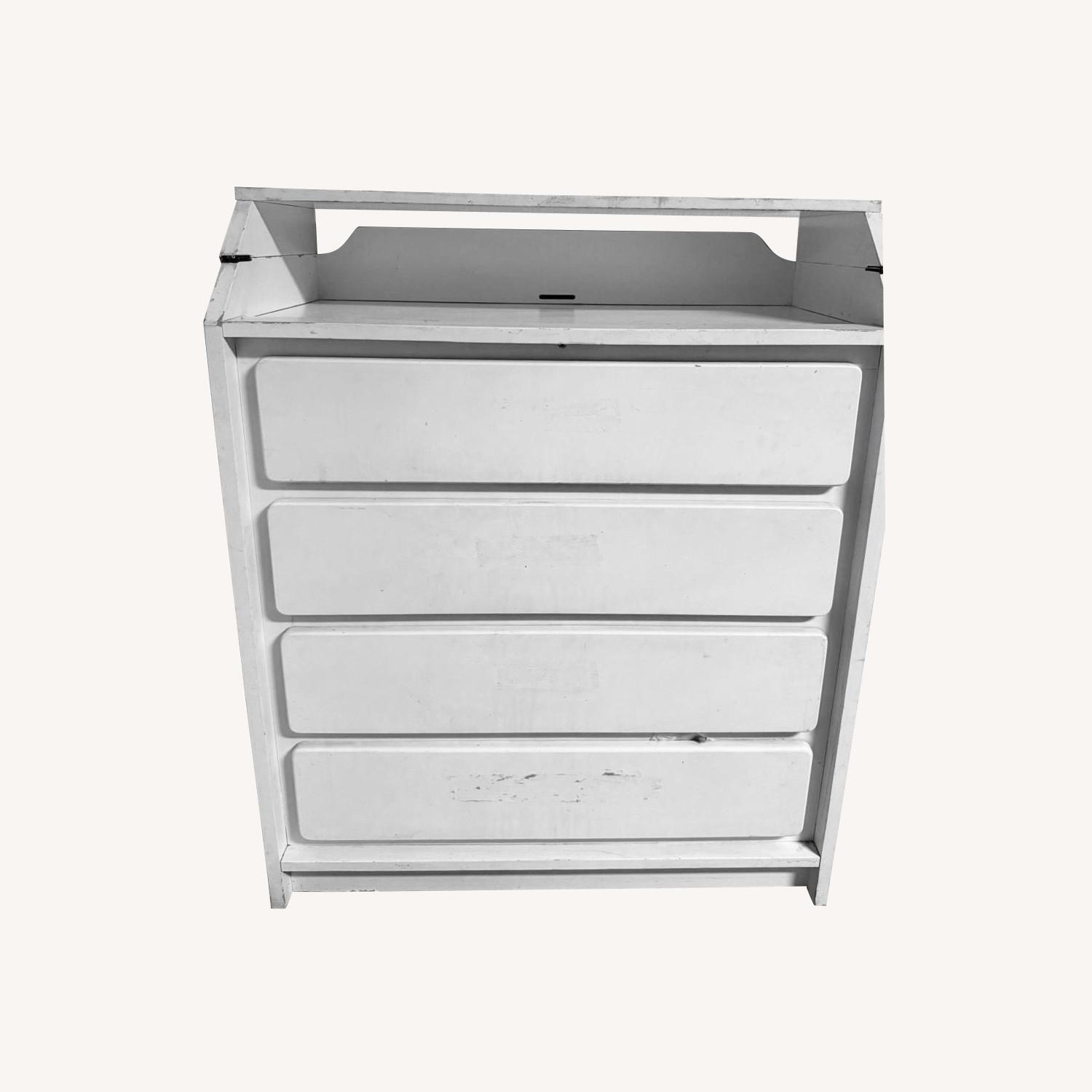Seller's Notes:This beautiful piece is a solid wood with white veneer dresser from the 80's. Made by Child Craft with a flip down top to convert into a baby changing table. Features four drawers in addition to the changing table component for storage! This dresser is sturdy and made of solid wood - built to last and still in great condition. Needs a new coat of paint but otherwise in excellent structural condition with no other signs of wear and tear - an opportunity to paint it the colors to match your nursery color scheme! 42.5” tall 27" depth of changing table total 17" depth of top with changing table flipped up / not in use 35" wide This dresser is sturdy which means it is HEAVY. Please message only if you can coordinate adequate transport and support. Pickup only!!