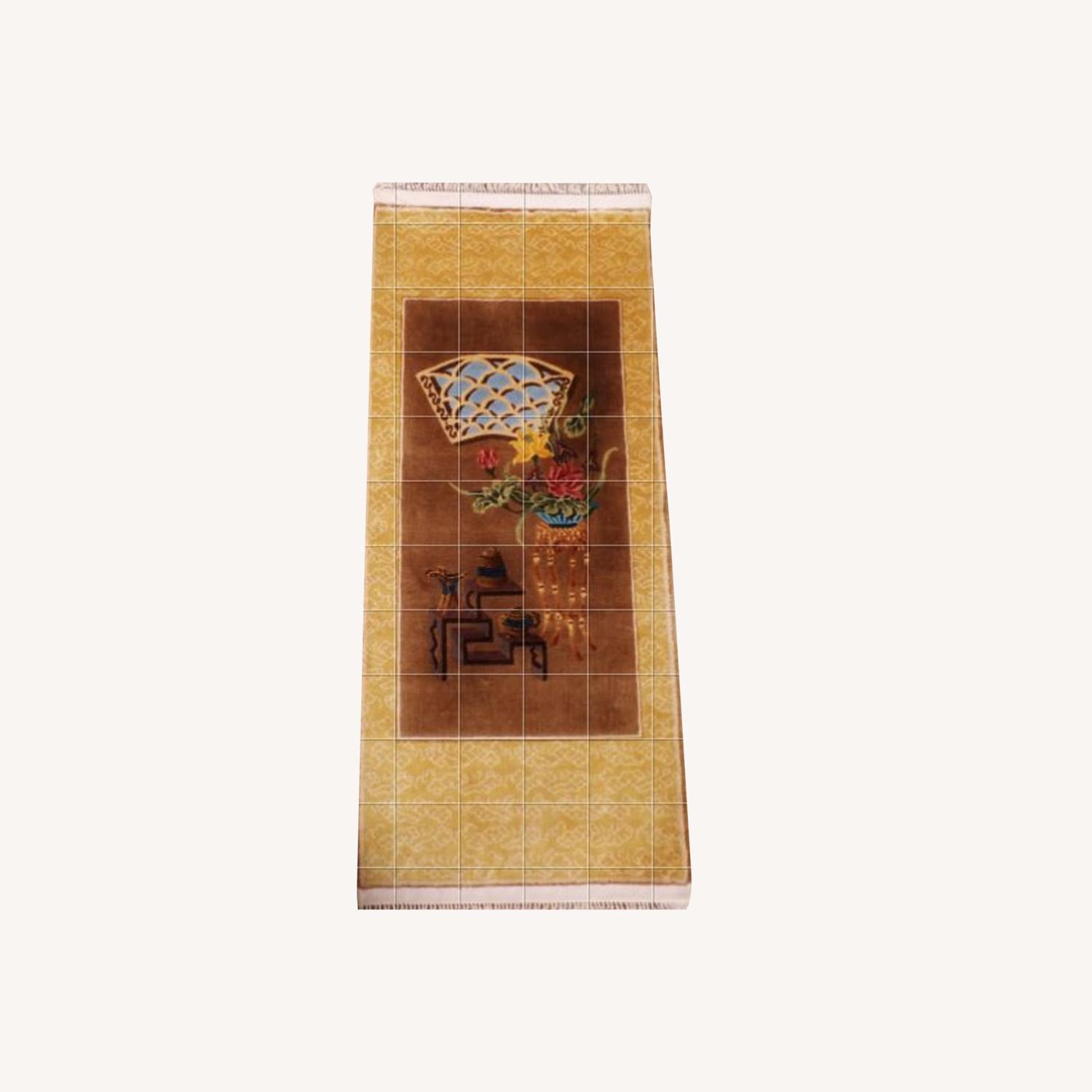 Seller's Notes:Wonderful Chinese Silk Handmade Carpet. Can be used either on the floor or hung on the wall. Measures 24 inches wide and 5 5 inches in length (including the fringe) 56 inches in length (not including the fringe). This carpet is in excellent condition, no stains, no signs of wear. ImageS one two and three are the front of the carpet and image four is the back of the carpet. The outside pattern is a medium golden/beige and the field is a medium golden/gray blend . This is a beautiful carpet and will work well in todays contempary/modern decor.. Will ship within the United State and to Puerto Rico. Will not ship international