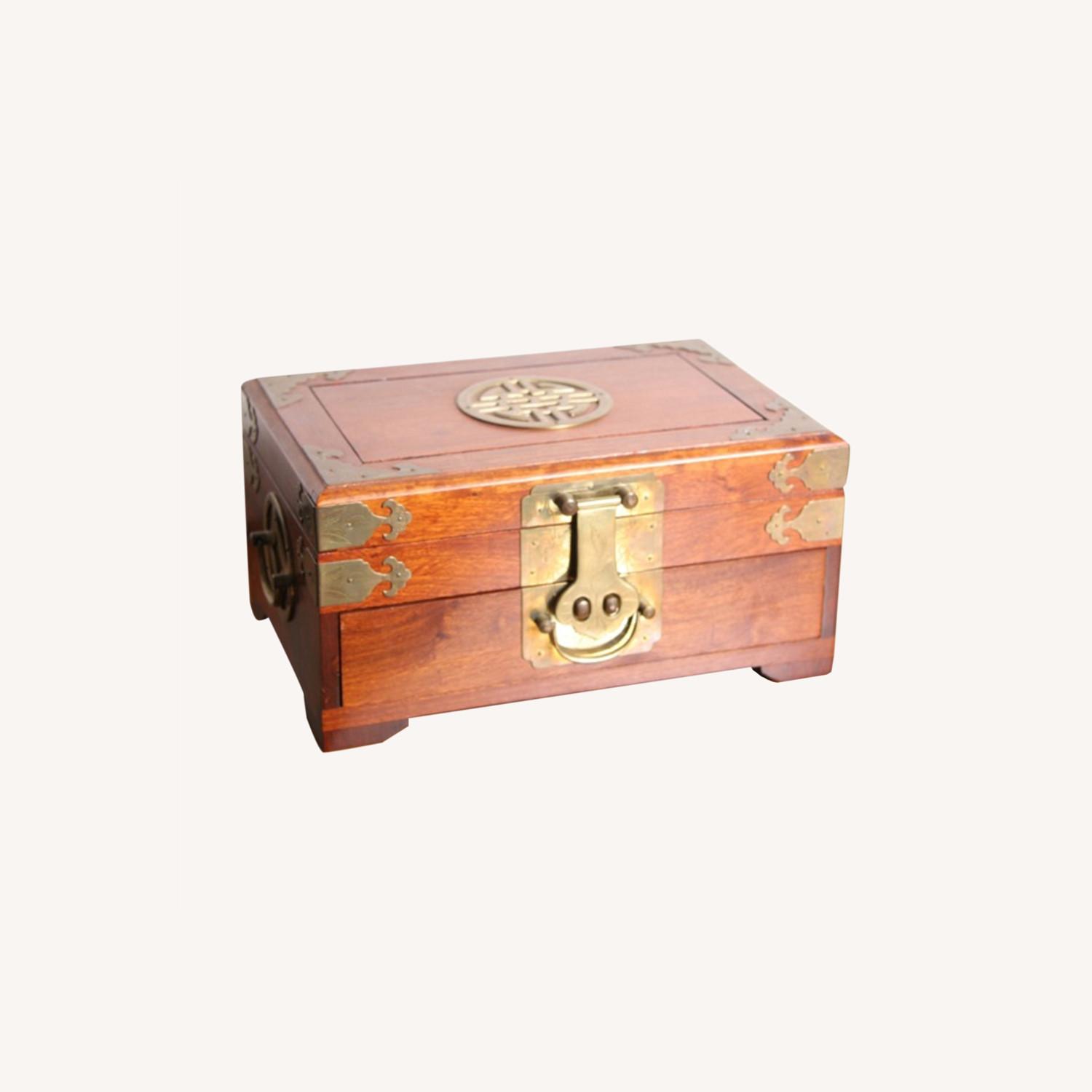 Seller's Notes:Chinese Jewelry Box Antiques Wood Box with Medallions, Top Lid Section and Drawer, Red Satin Interior Size: 6 x 21 x 8 in. (15.24 x 53.34 x 20.32 cm)