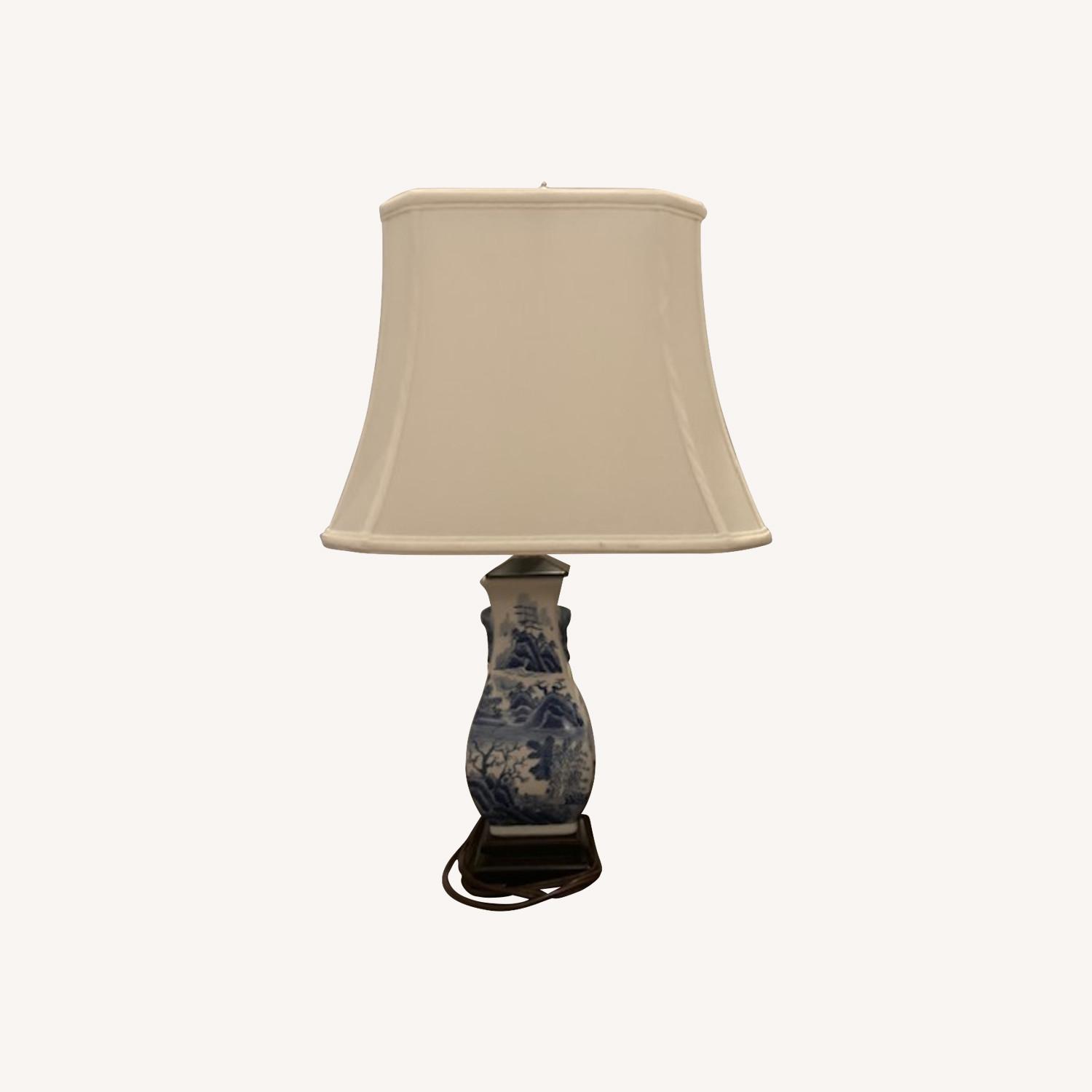 Seller's Notes:Beautiful antique traditional blue and white chinese lamp with finial and square shade.