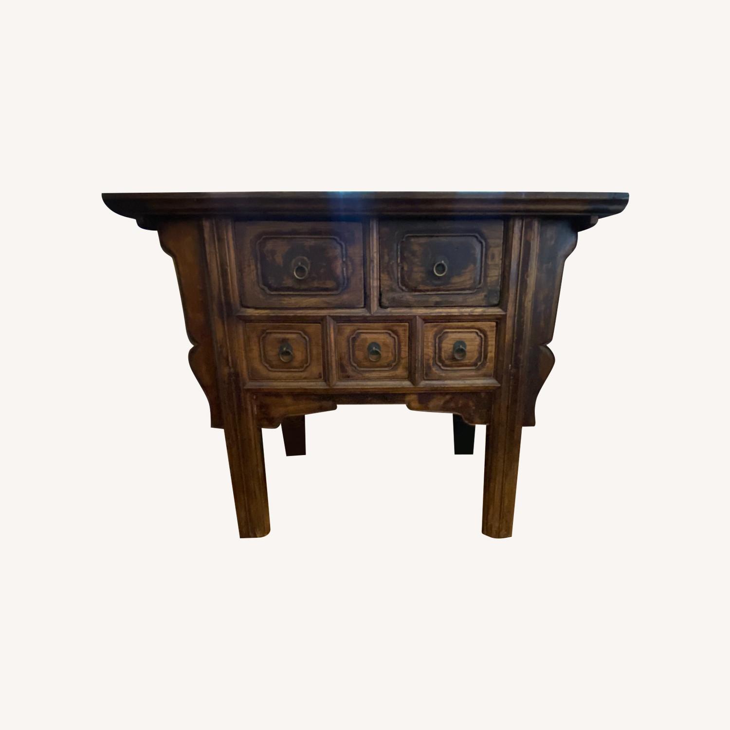 Seller's Notes:Chinese-style desk / buffet table / sideboard for sale. Solid wood. Bought from an antique dealer many moons ago in NYC. Five drawers. Excellent storage for an office. Well taken care of in a pet- and smoke-free home. Size is 40" long x 31.5" tall x 18.5" deep. I am moving to Texas and getting rid of all of my furniture -- make me an offer!