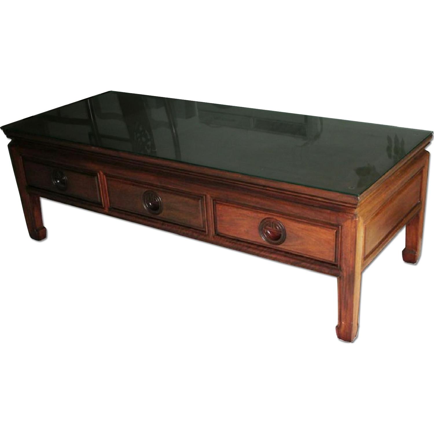 Seller's Notes:This Chinese style rosewood coffee table is Ming Dynasty design, comes with glass top and 3 drawers, 14 W * 15 D * 6" H each.