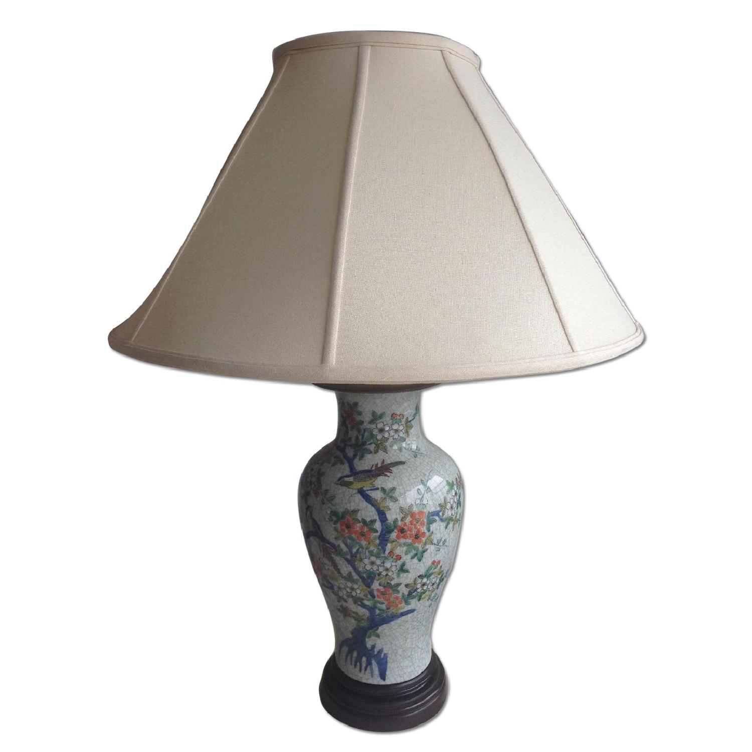 Seller's Notes:Two hand-painted porcelain (I believe) table lamps with shades. The lamps and shades are solidly made and in very good condition. I was given them by a relative, so I do not know the manufacturer of the lamps, but the shades have a label that says "Custom tailored by Roseart." These are high quality lamps. The base of the lamp is 6.5", but the widest part measures approx. 8". The base of the shade is 22" and the height is 11"