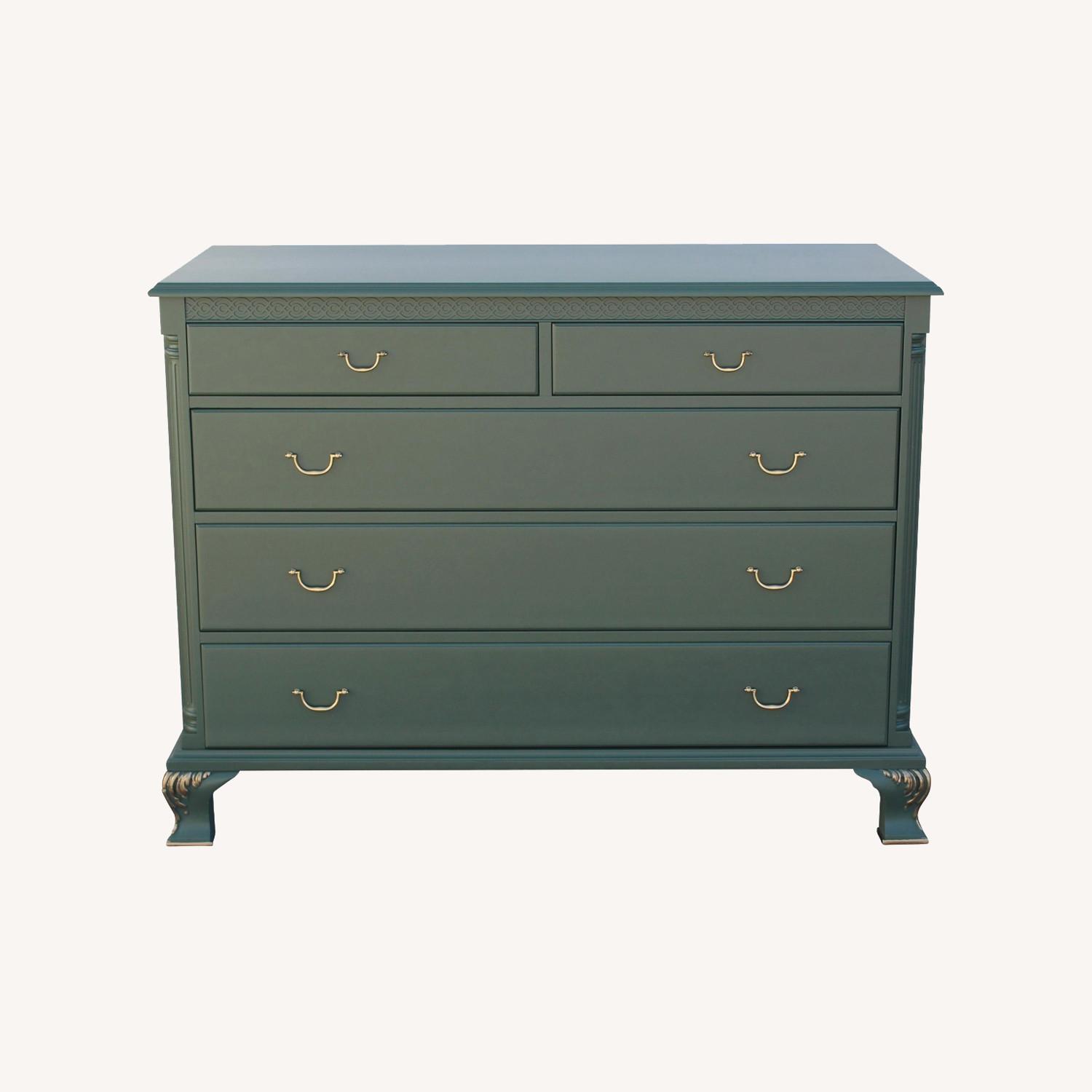 Seller's Notes:Vintage solid built chippendale chest of five drawers. This chest is newly refinished in dark green with satin topcoat. Dimensions:48”Width x 22”Depth x 34”Height. See pictures and condition for reference. Professionally refinished, Good Condition, Original Design Modified, vintage piece, may have some minor imperfections. If you have any question, please let me know, thank you.