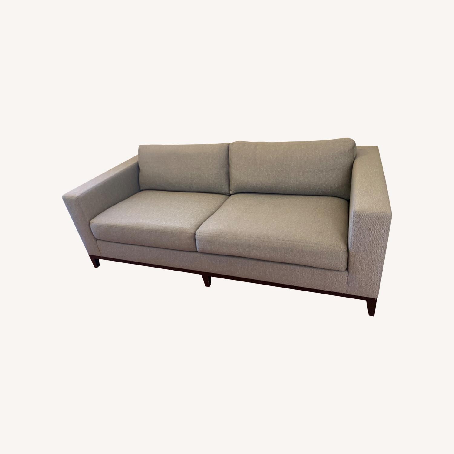 Seller's Notes:Modern Sofa. Interior: down fill Exterior: silk fabric (grey & tan weave) Legs: wood (dark brown)