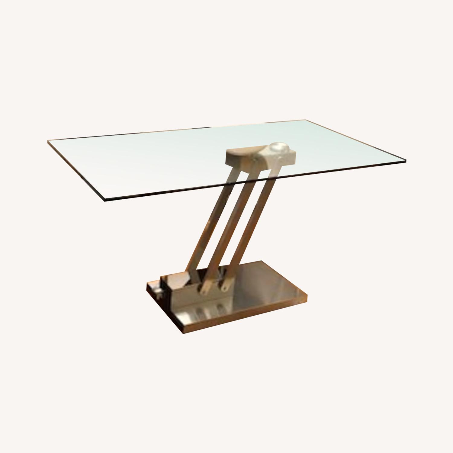 Seller's Notes:This is a gorgeous glass and chrome table and we are very sad to have to part with it. We are only looking to sell it because we are moving and do not have space for it in our new home. It is a glass dining table that can easily fit 6 people, two on each side and one at each head. It ha a modern heavy chrome base which has a lever on it that allows you to make the table lower so it can be used as a coffee table as well. For Manhattan / Apartment Dwellers this is an amazing find as you can save space by getting a table that fits two bills.