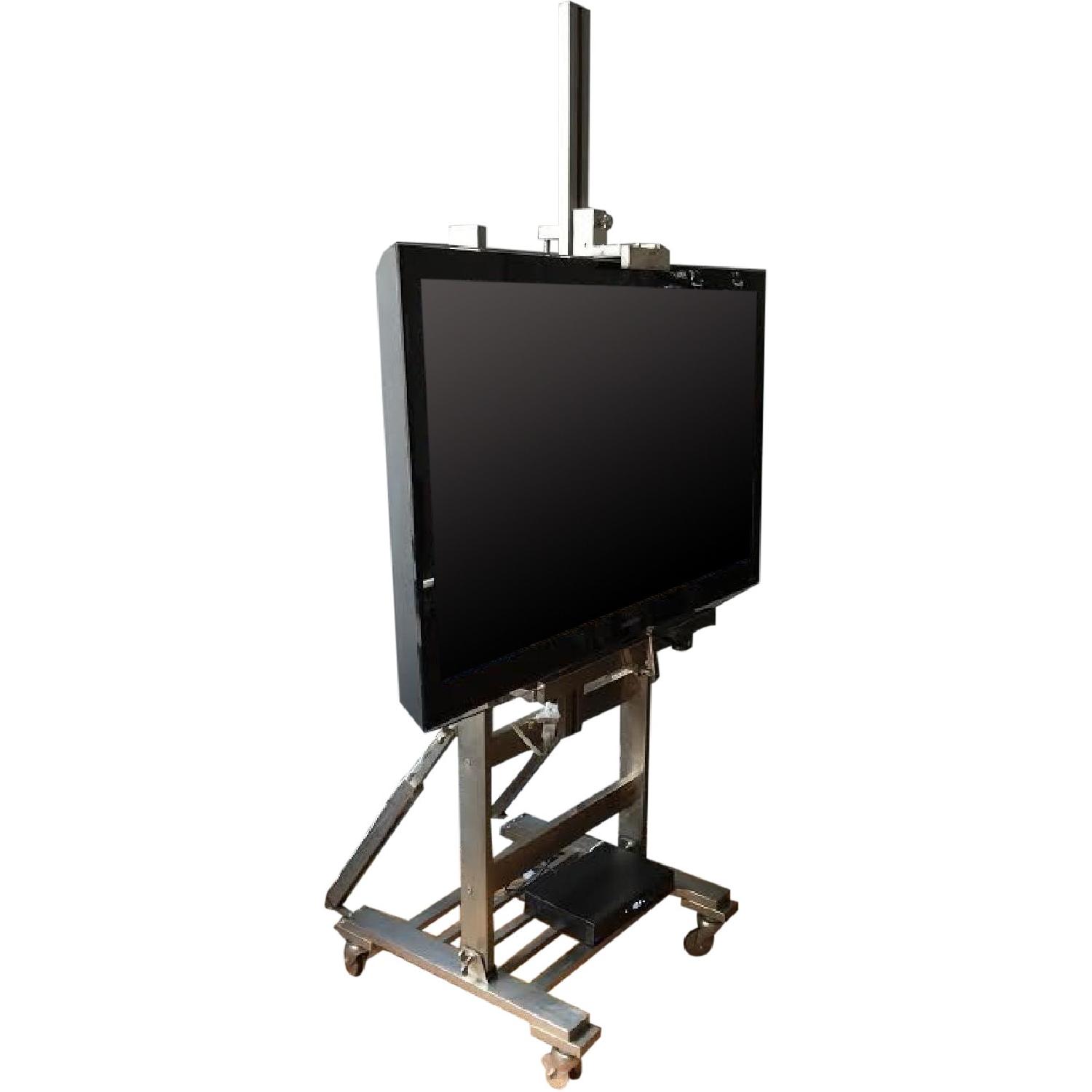 Seller's Notes:This easel TV stand is placed on casters and fashioned from an adjustable base of metal and woo. The sturdy easel can be positioned precisely as desired for whatever size your TV is. This easel stand is a true conversation piece and in mint condition.