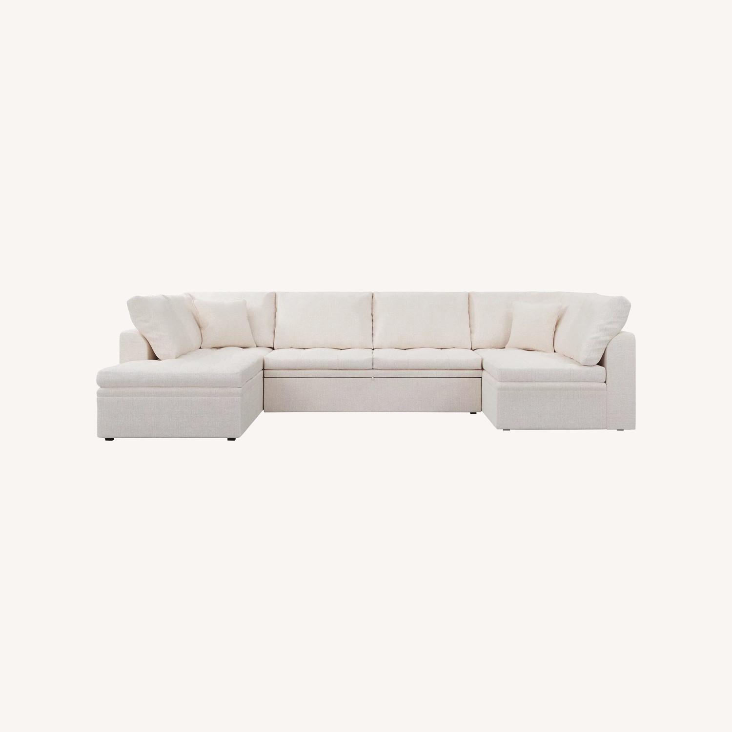 Seller's Notes:Relax in your living room with the contemporary style of the Sheridan Square sectional from Cindy Crawford Home. This stunning sectional is upholstered in cozy off white chenille fabric that helps you relax without sacrificing on durability. The beautiful appearance of this sectional is highlighted by tufting on the seat cushions and loose back cushions that add a casualness to the piece. The perfect finishing touch to this sectional is a pop-up trundle sleeper that conveniently tucks away under the piece when not in use by overnight guests. Upholstery: 100% Polyester. Accent pillows not included.