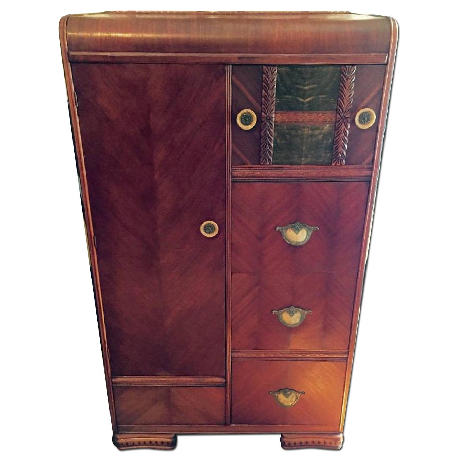 Seller's Notes:Feel in love with this armoire at an antique fair in the city a few years ago, sadly selling it because we're moving to the West Coast. The armoire is a beautiful dark wood with some lovely details. It has a few light scratches here and here and the wood is slightly chipped on the top left side (see photo).
