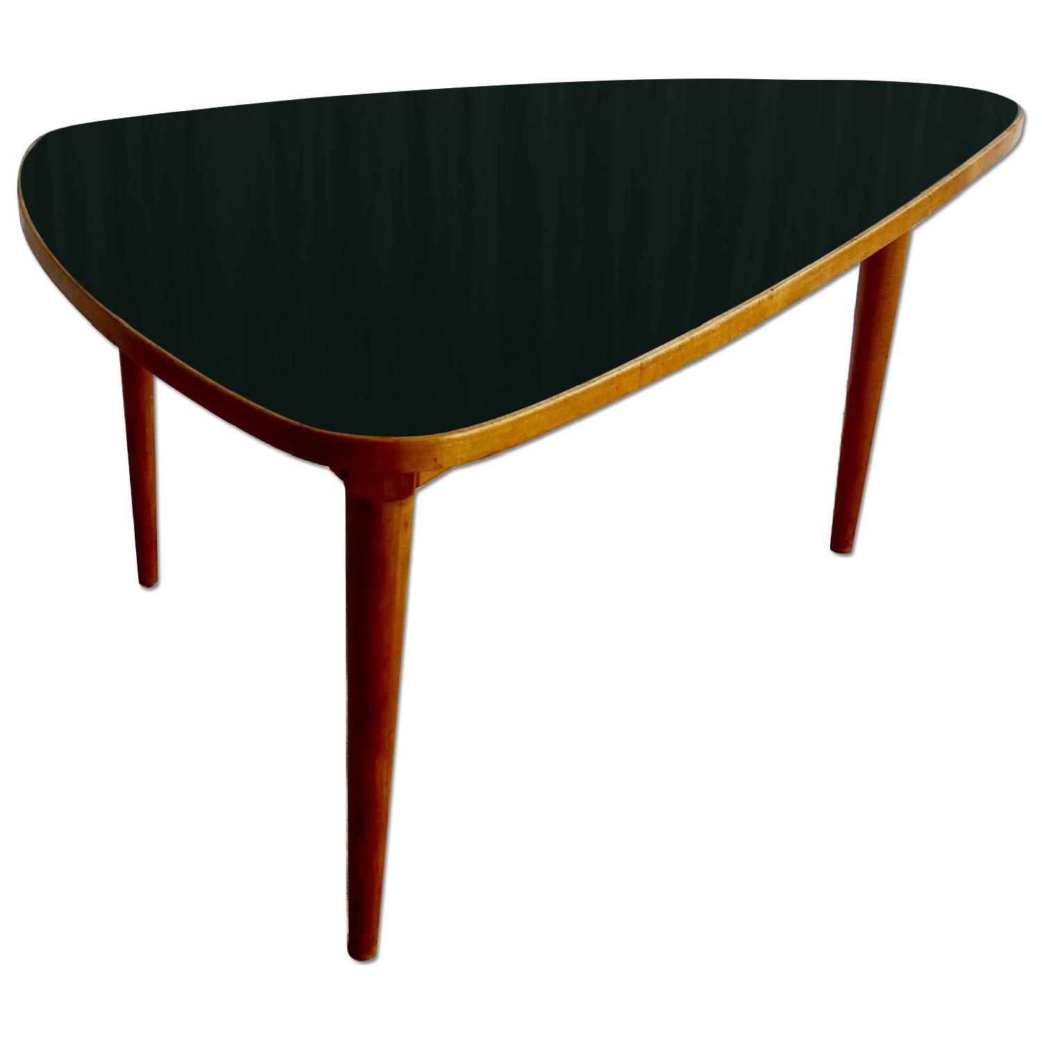 Seller's Notes:A mid century modern triangular coffee table with ebonized top and turned legs, circa 1960.