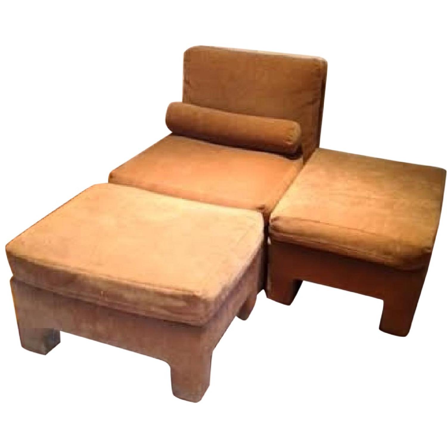 Seller's Notes:chaise set circa 80's - recently reupholstered in striated microfiber velveteen chair D 32 x W 25 X H 30 / ottomans (2) D 21 x W 26 x H 17 3 bolster pillows with zippers - ottomans also have slipcover tops that are removable many possibilities for arranging the 3 pieces