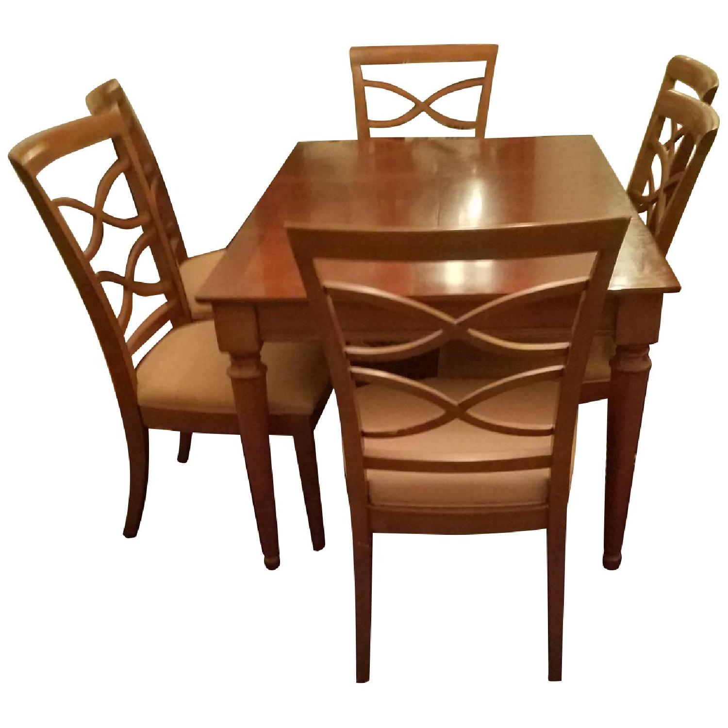 Seller's Notes:Gorgeous, stylish, classic dining room table and chairs. Solid wood, fine craftsmanship, excellent condition. Table has imbedded drop leaf. Extends from 40" to 72". Six large, solid chairs, each 19" w x 22" d x 40" h. Matching wood table height extenders (screw in) included. A beautiful addition to your home. Owner has moved to a smaller apartment and hates to part with the set, but it doesn't fit new space.